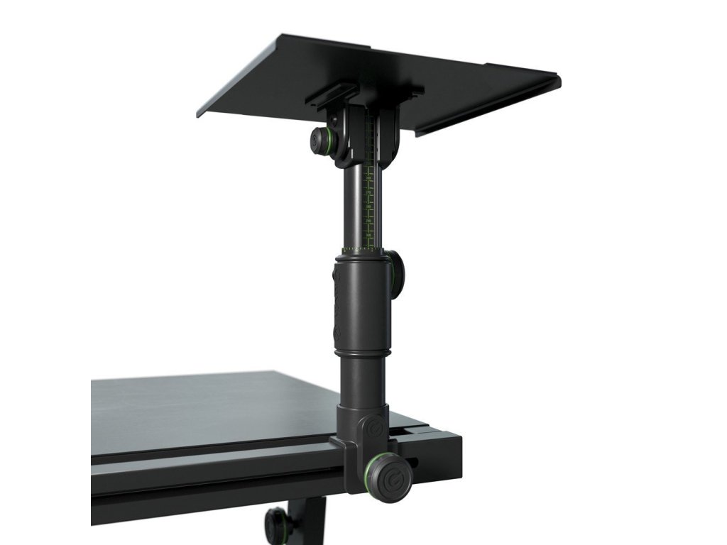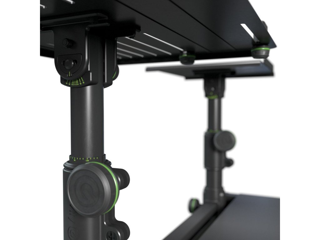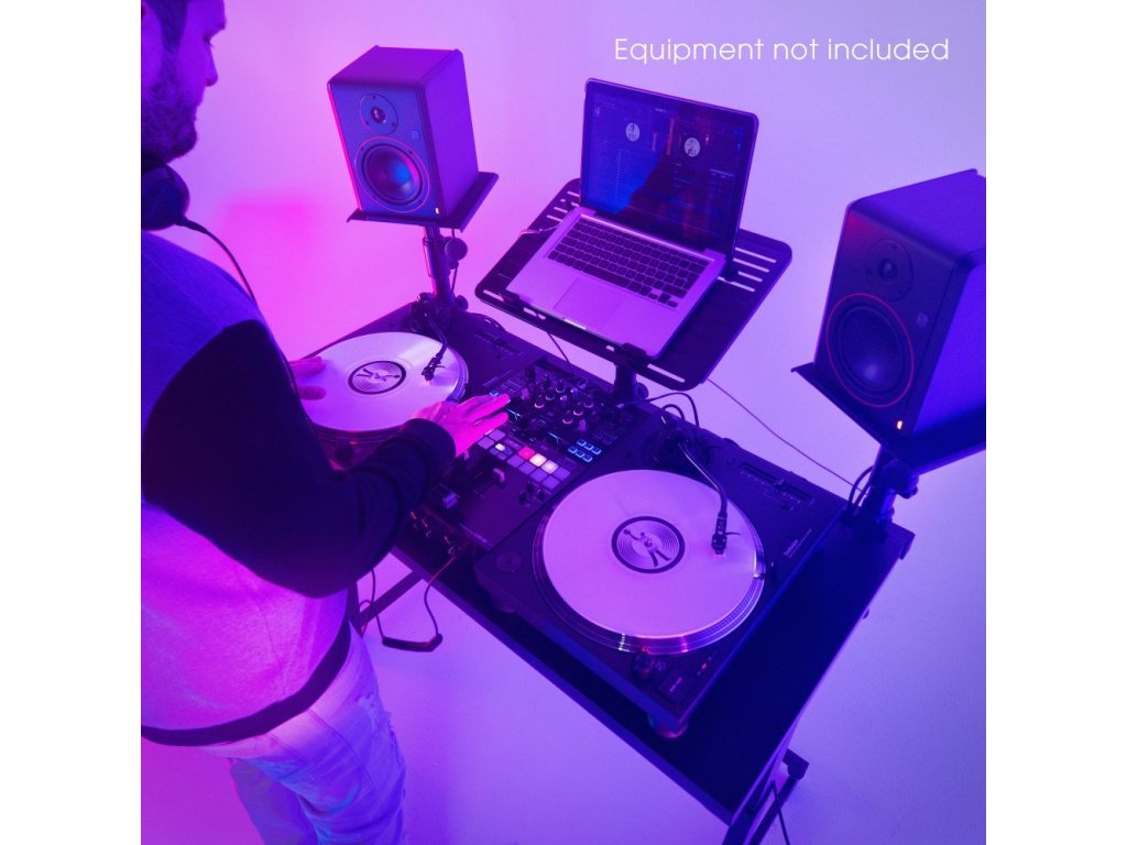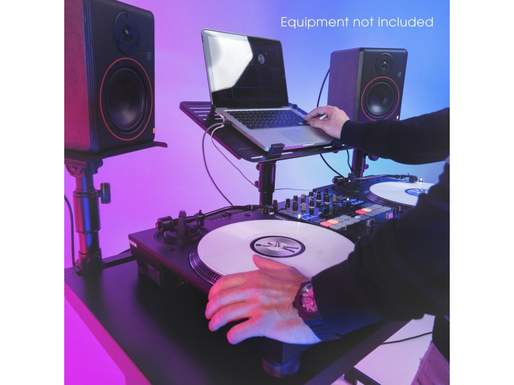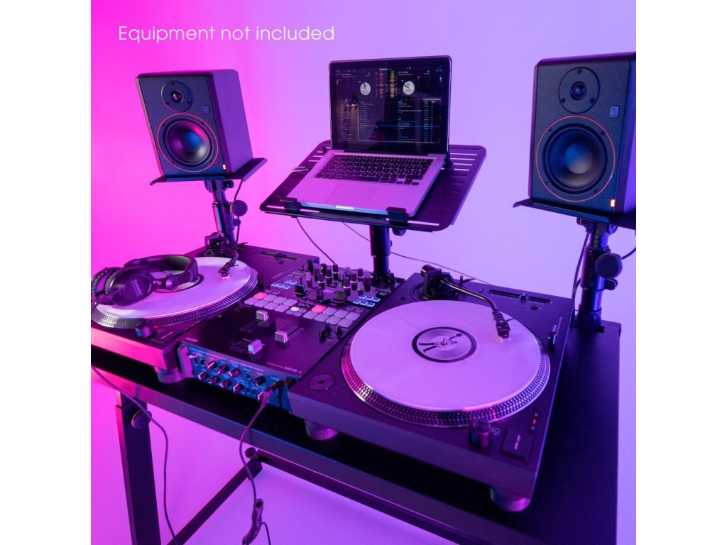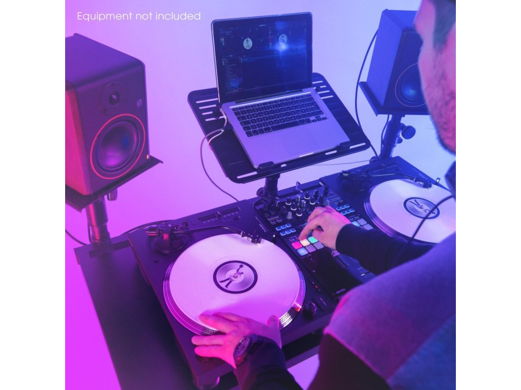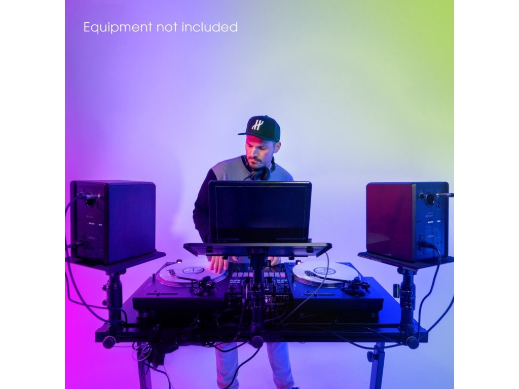 Kreatywność nie zna granic, ale przestrzeń robocza już tak. Miejscem, w którym możesz się bez ograniczeń rozłożyć, jest stół DJ Gravity® FDJT 01. Na nim Twój sprzęt będzie zawsze gotowy do użycia. Twoje monitory można umieścić na stojakach z regulacją wysokości, obracanych o 360° i pochylanych o 15°. Precyzyjna skala na rurach znacznie ułatwi ustawienie nachylenia głośników. Twój laptop znajduje się na środku biurka i jest mocno trzymany na miejscu przez zintegrowane kołki, dzięki czemu nawet przy ekstremalnym nachyleniu jest zawsze zamocowany. Uchwyty głośników i laptopów można precyzyjnie regulować wzdłuż tylnej szyny biurka DJ Gravity® FDJT 01, przesuwając je w lewo lub w prawo.