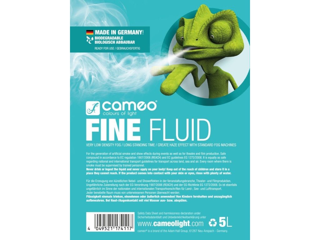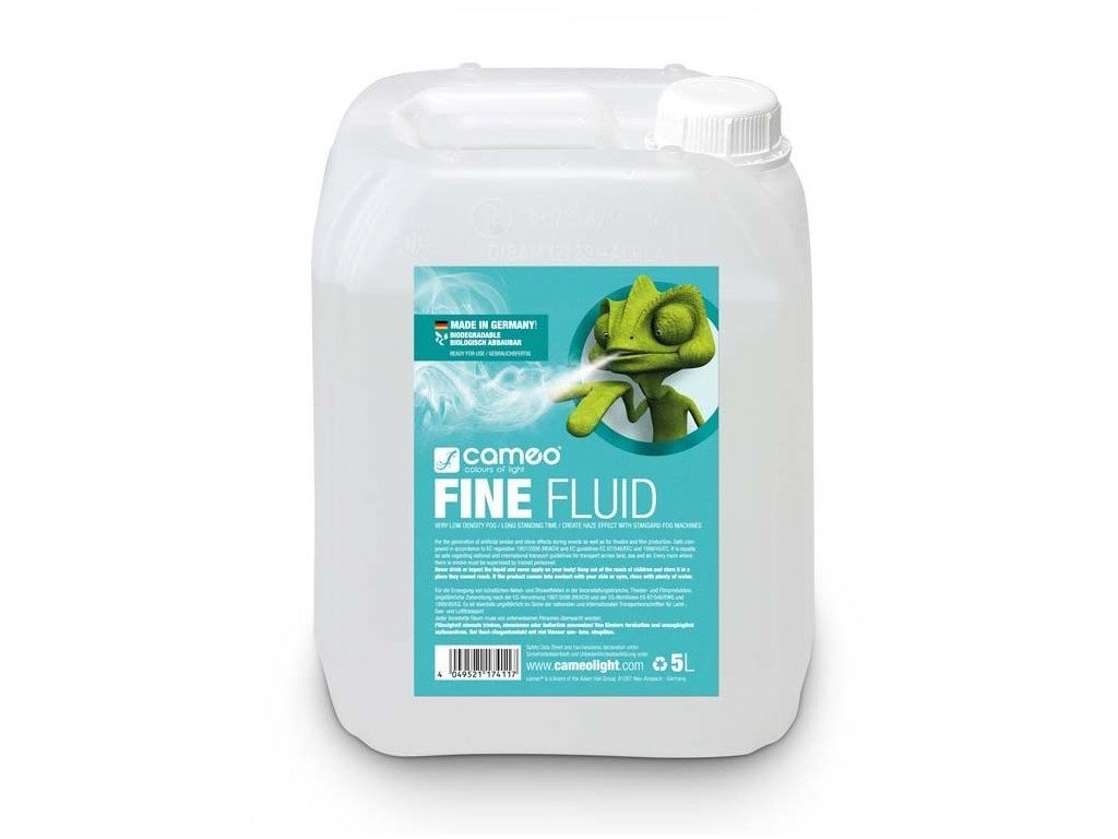 Cameo Fine Fluid nadaje się do wszystkich standardowych wytwornic mgły. Wytwarza bardzo delikatną mgłę bez zapachu, o bardzo długim czasie utrzymywania się i doskonałych właściwościach odbijających światło. Płyn jest biodegradowalny i nieszkodliwy dla zdrowia.