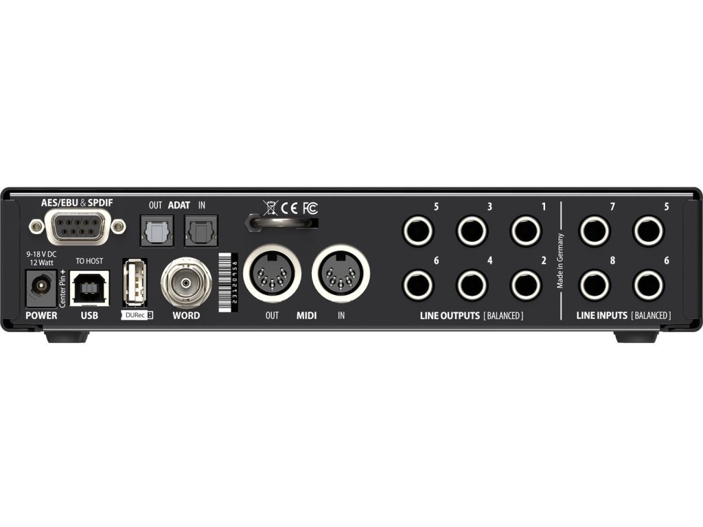 DURec to zintegrowany cyfrowy rejestrator dla wszystkich wejść i wyjść bezpośrednio do pamięci masowych USB przez tylny port USB. Umożliwia nagrywanie na dyski flash USB lub dyski twarde o pojemności do 2 TB. Funkcja nagrywania zapewnia wewnętrzny DSP, a zatem jest niezależna od podłączonego komputera z systemem Windows lub Mac. Ten port USB może być alternatywnie używany do bezpośredniego podłączenia opcjonalnego zdalnego sterowania RME ARC USB.