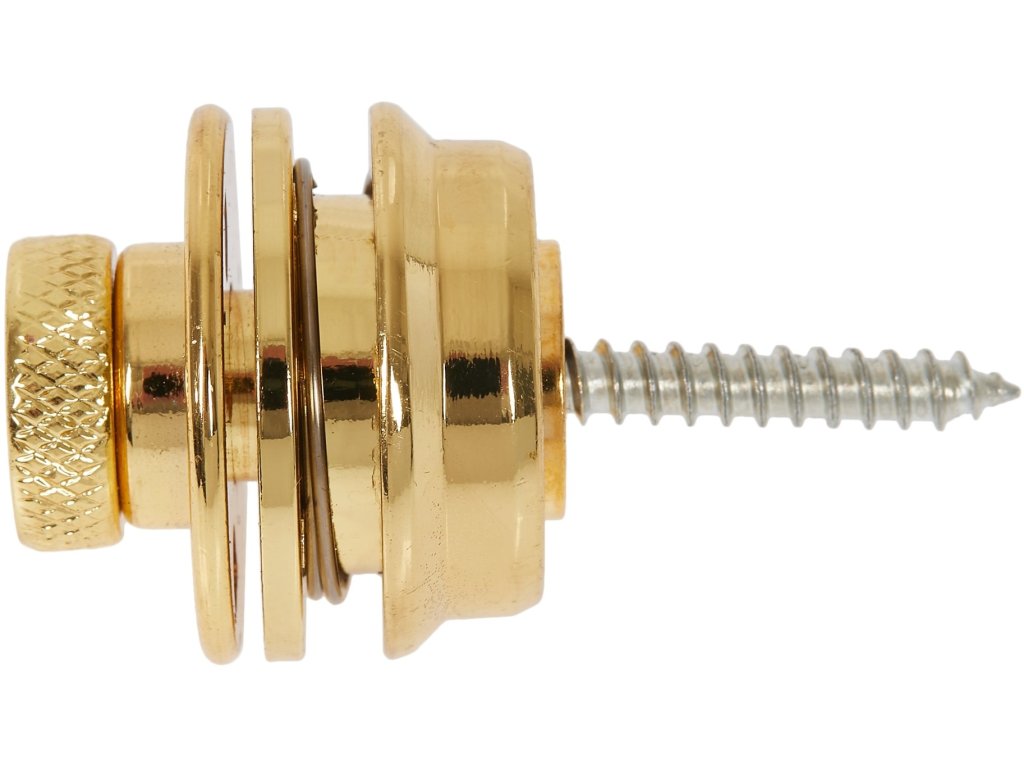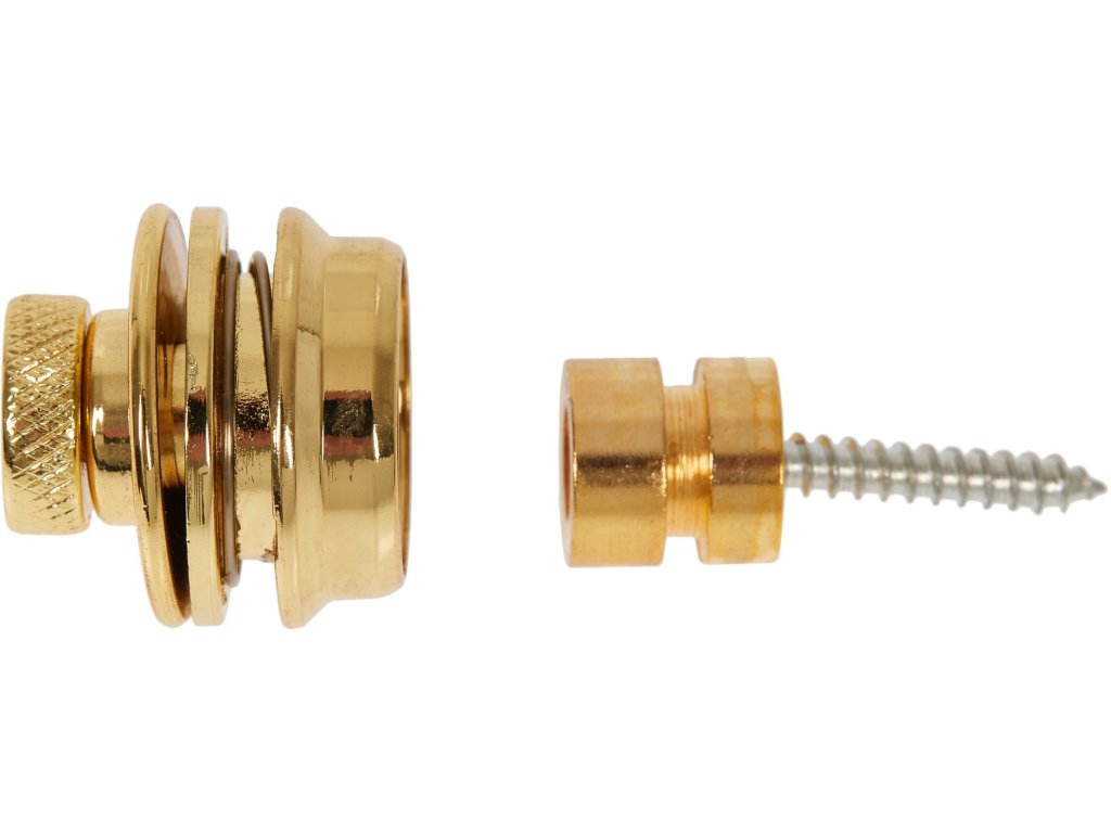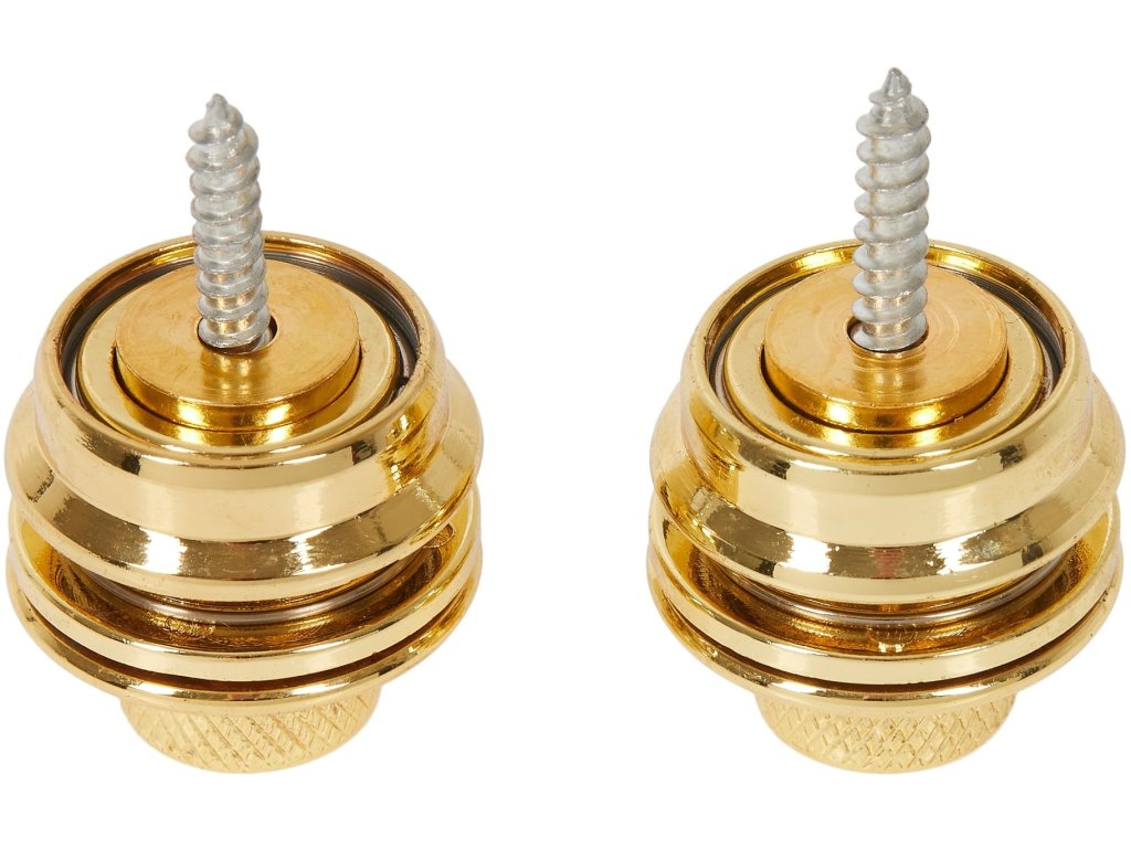 Zestaw zamków zabezpieczających firmy Razzor w złotym wykończeniu, które zapobiegają wysunięciu się instrumentu z paska i jego uszkodzeniu. Pasuje do wszystkich pasków gitarowych i basowych.