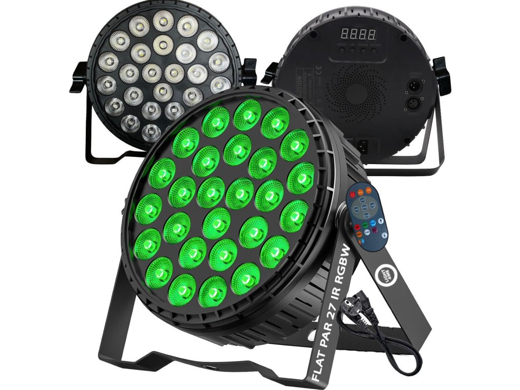 Light4Me Flat Par 27 IR RGBW to profesjonalne, wysokiej jakości urządzenie oświetleniowe, które jest doskonałym rozwiązaniem dla każdego, kto potrzebuje efektownego i robiącego wrażenie oświetlenia scenicznego. Reflektor sceniczny oferuje niesamowitą jakość światła dzięki dwudziestu siedmiu mocnym diodom LED w palecie barw RGBW o mocy aż 6 W każda, co gwarantuje świetną skuteczność świetlną na poziomie 80 lm/W, solidny wskaźnik oddawania barw wynoszący 80 oraz wyjątkowy strumień świetlny sięgający nawet 9000 lumenów. Dzięki pełnozakresowemu ściemniaczowi (dimmerowi) użytkownicy mogą z łatwością dostosować jasność światła do swoich potrzeb. Urządzenie oświetleniowe wyposażono w stroboskop z regulowaną prędkością, co pozwala na tworzenie dynamicznych efektów świetlnych.