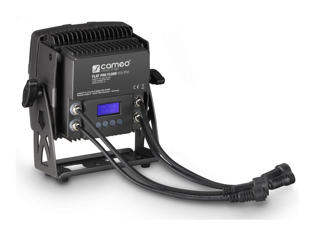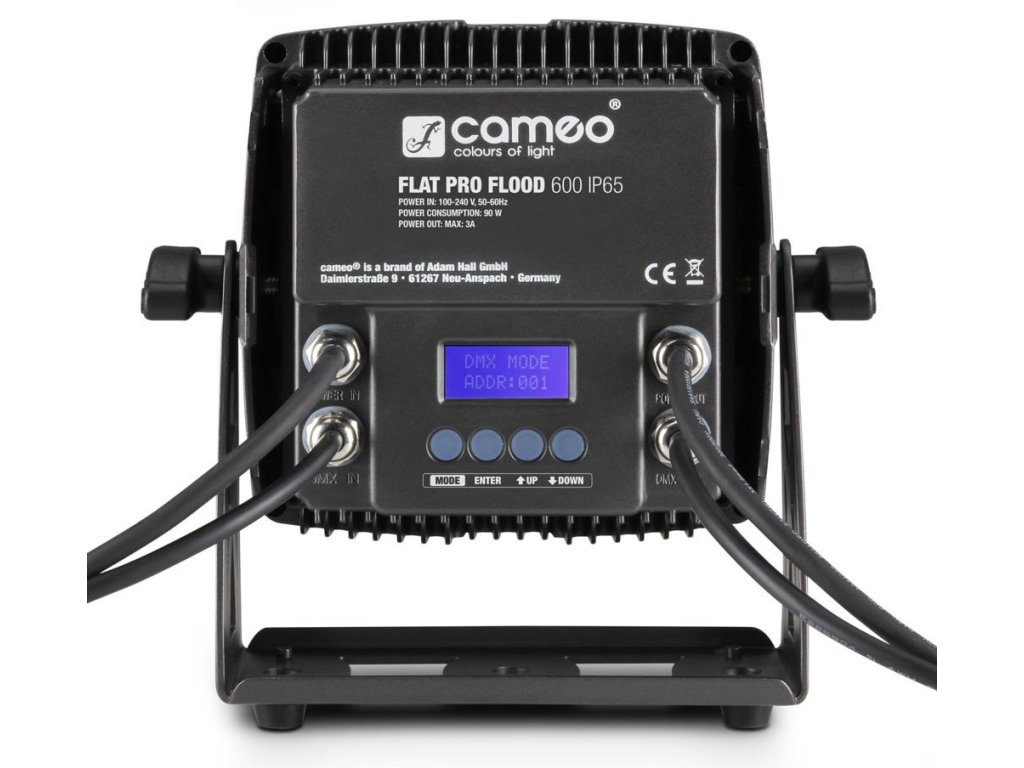Solidna metalowa obudowa zawiera 3-pinowe złącza śrubowe dla DMX oraz wejście i wyjście sieciowe, a także podświetlany wyświetlacz dla łatwej i intuicyjnej obsługi, a blokada bezpieczeństwa zapobiega nieautoryzowanemu dostępowi do menu. Cameo FLOOD 600 IP65 oferuje 6 trybów sterowania DMX z funkcją ściemniania i stroboskopu, korekcją temperatury barw i aplikacjami master, slave i autonomicznymi.