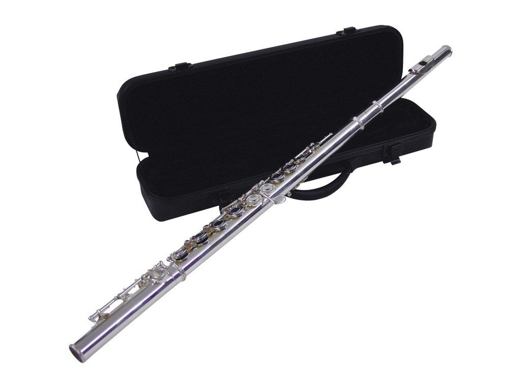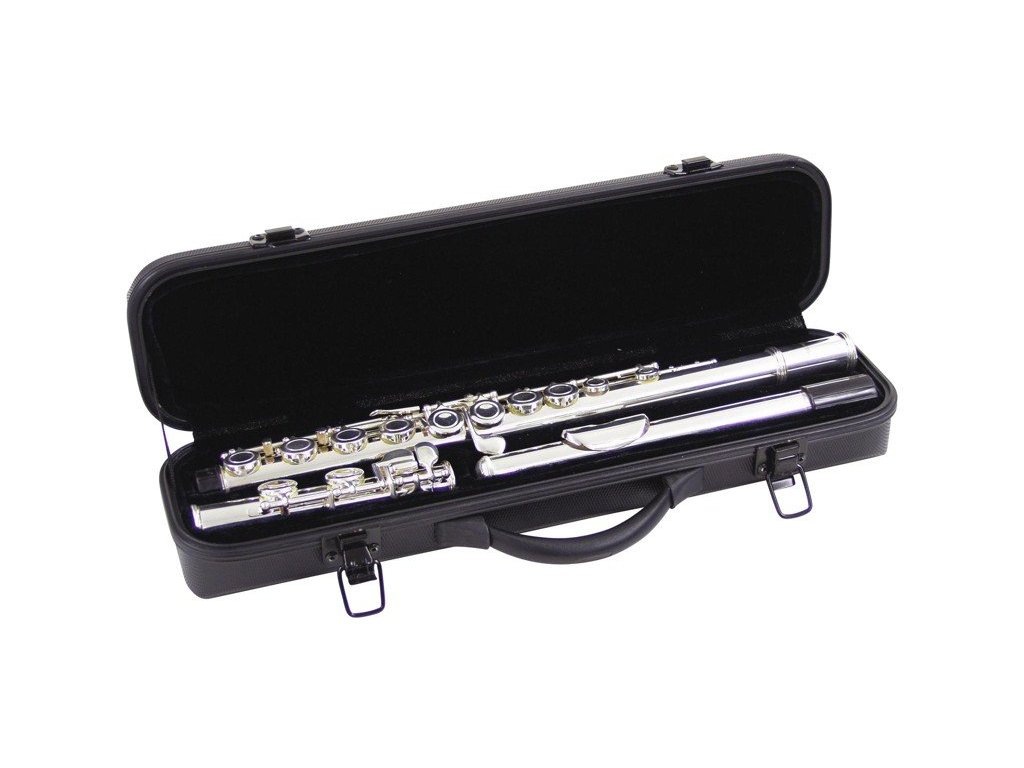 Flet poprzeczny C, zamknięte klapy (system Plateau), z mechaniką E, wysunięte G, posrebrzany, z plastikowym kufrem.