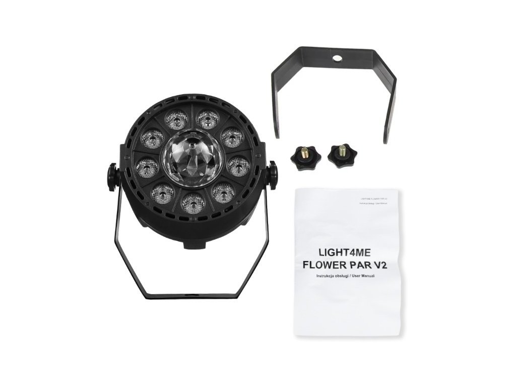 LIGHT4ME FLOWER PAR V2 ma kompaktowe wymiary i niską wagę, co ułatwia jego transport i instalację. Uchwyt montażowy umożliwia szybką instalację reflektora w dowolnym miejscu. Złącza DMX umożliwiają łatwe podłączenie do innych urządzeń oświetleniowych, co jest szczególnie przydatne podczas imprez wymagających większej ilości efektów świetlnych. Dzięki wąskiemu kątowi świecenia reflektor doskonale oświetli małe i średnie pomieszczenia, zapewniając imponujące wrażenia wizualne.