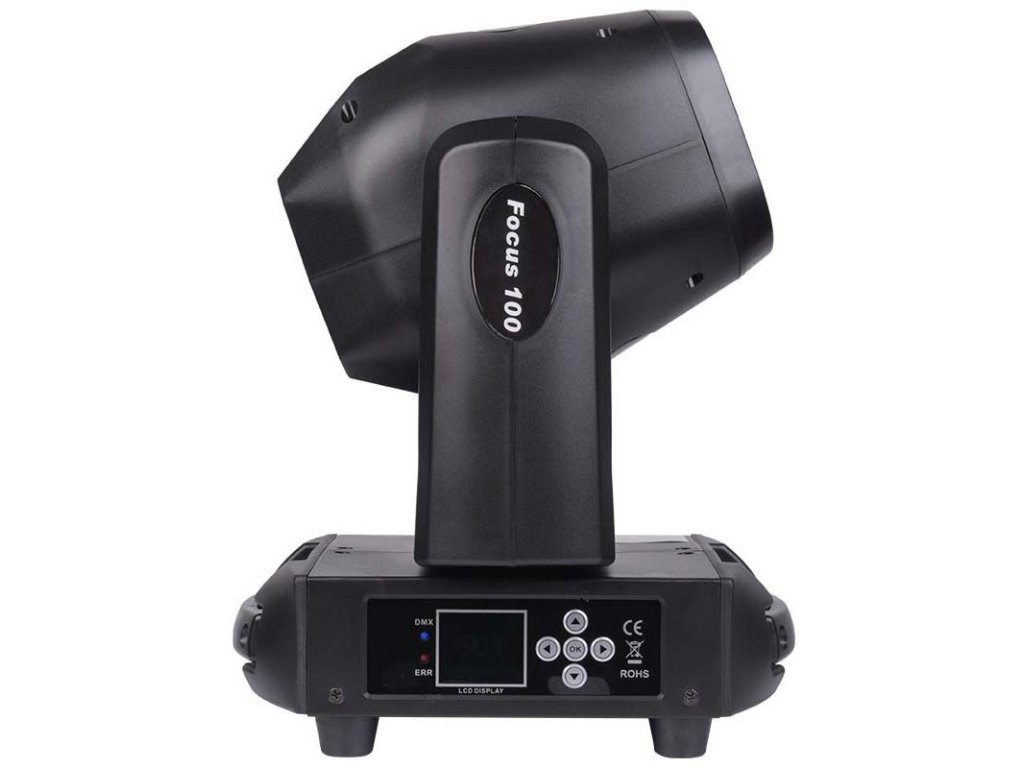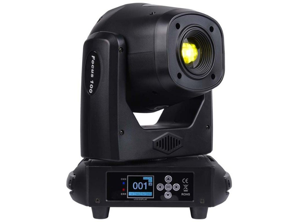 Ruchoma głowa Focus 100 Spot LED jest wyposażona w wydajną, białą diodę LED o mocy 100 watów, dzięki czemu doskonale nadaje się również na większe sceny. Na kole kolorów znajduje się 7 filtrów, które barwią światło. Koło gobo zawiera 6 nowoczesnych wzorów formujących strumień światła. Dodatkowy efekt tworzy okrągły pryzmat dzielący światło na 5 promieni.