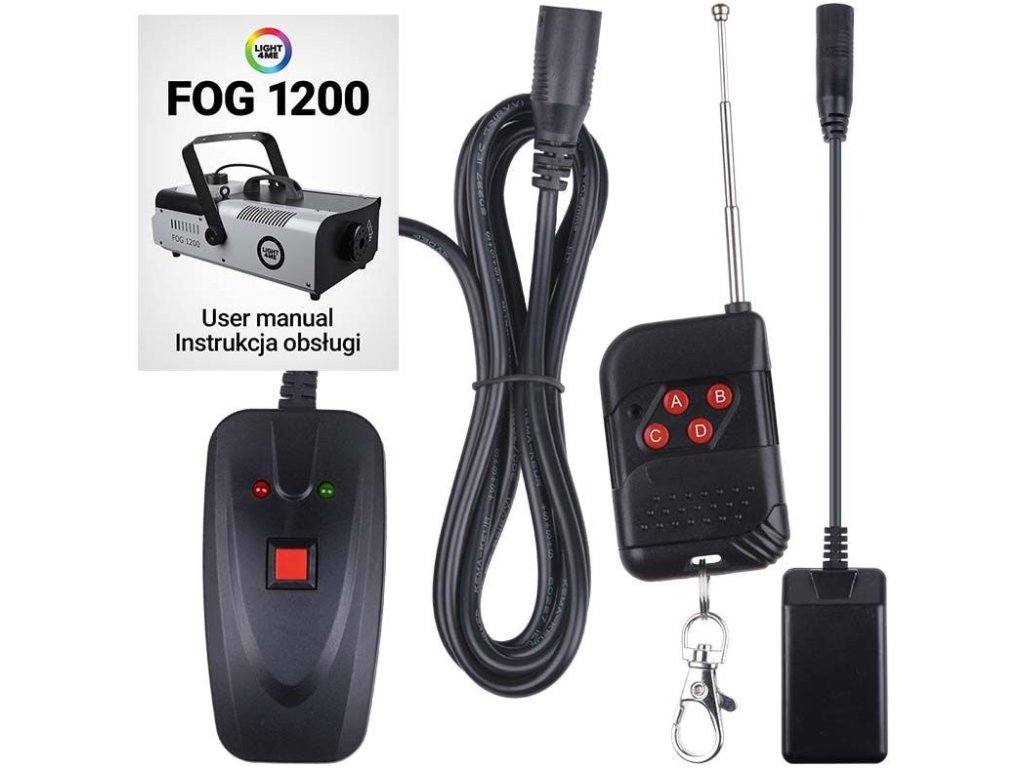- Zawartość zestawu: Wytwornica mgły Fog 1200, sterownik kablowy (kabel 3m), bezprzewodowy pilot zdalnego sterowania, odbiornik bezprzewodowego sterownika, kabel zasilający, uchwyt montażowy, krótka instrukcja obsługi