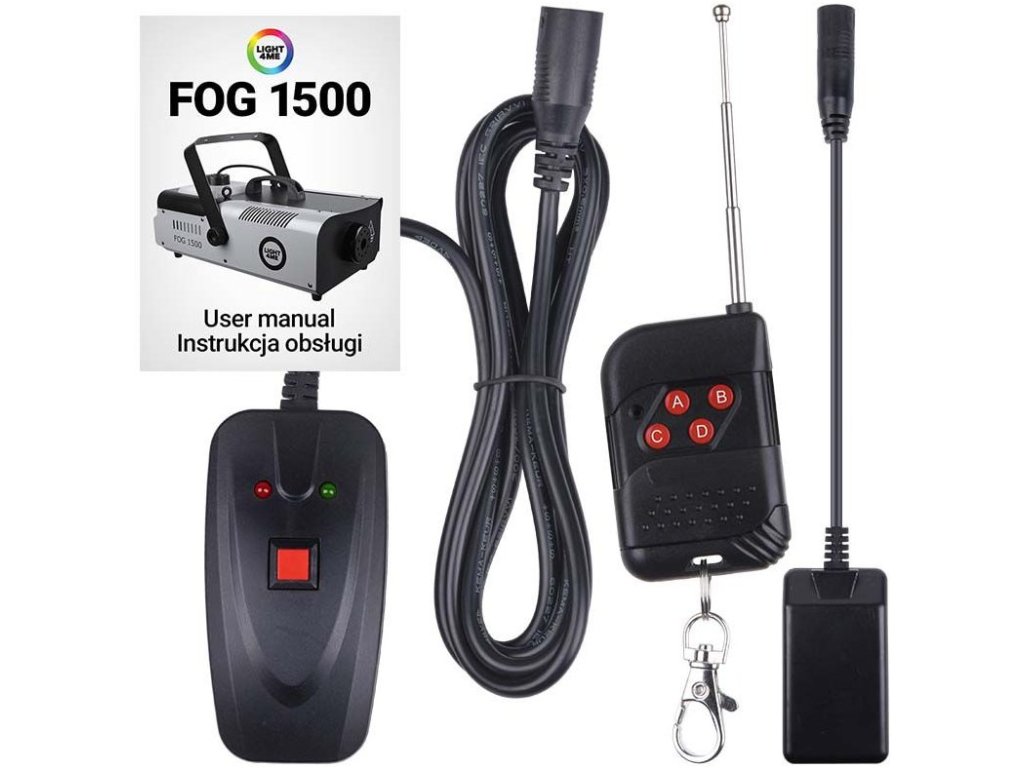 - Zawartość zestawu: Wytwornica dymu Fog 1500, sterownik kablowy (kabel 3m), bezprzewodowy pilot zdalnego sterowania, odbiornik bezprzewodowego sterownika, kabel zasilający, uchwyt montażowy, skrócona instrukcja obsługi