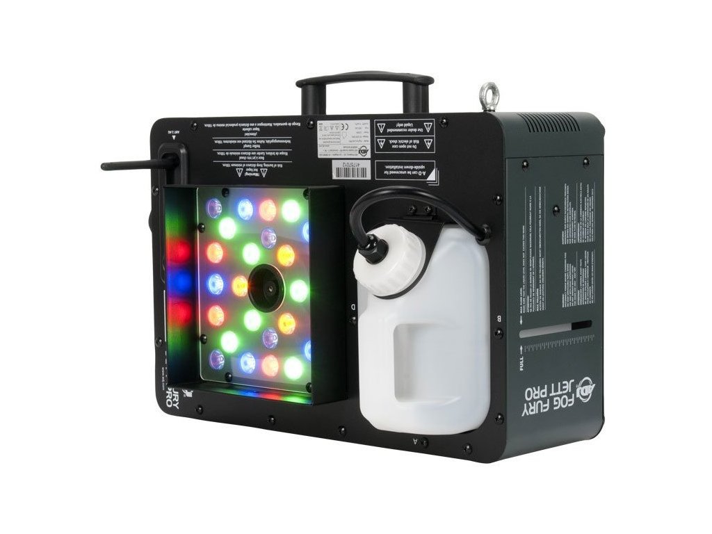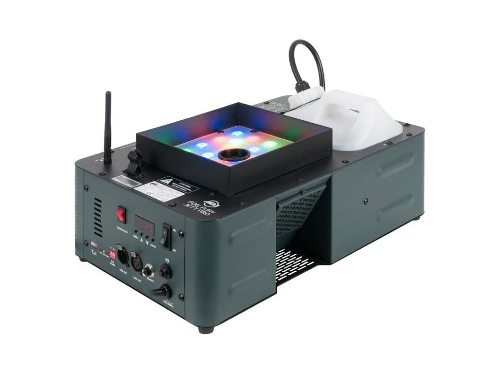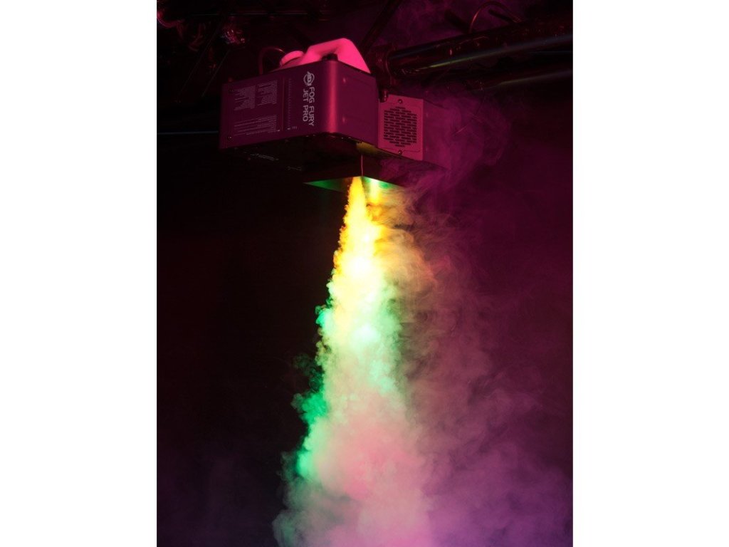 Fog Fury Jett Pro firmy ADJ to szybka, pionowa wytwornica mgły, która miesza kolory z 28 diod LED 3W (6 czerwonych, 7 zielonych, 6 niebieskich, 3 bursztynowych i 6 UV). Fog Fury Jett Pro tworzy suche, równomierne obłoki mgły na 12 metrów w powietrze. Wytwornica ma specjalną konstrukcję elementu grzejnego, który do przesyłania rurociągiem używa oleju, co zapobiega zatykaniu i zapychaniu. Ponadto jest wyposażona w wysokowydajny system pompowy zapewniający optymalną wydajność. Wytwornica wykorzystuje technologię ETS (elektroniczny pomiar temperatury) firmy ADJ, aby zapewnić optymalny poziom ciepła, z bardzo krótkim czasem nagrzewania między poszczególnymi wyrzutami mgły.