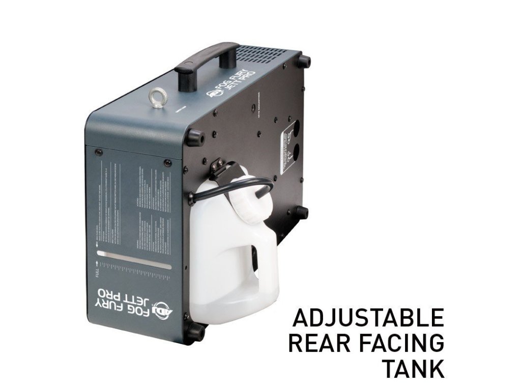 Fog Fury Jett Pro może być używana pionowo i poziomo. Zbiornik można zamontować z przodu lub z tyłu urządzenia, aby wytwornica mogła kierować mgłę do góry lub na dół. Do celów sterowania urządzenie jest wyposażone w 3-pinowe i 5-pinowe wejścia/wyjścia DMX, bezprzewodową technologię WiFLY EXR firmy ADJ, panel sterowania DMX, a w zestawie znajduje się również bezprzewodowy pilot FFJWR.