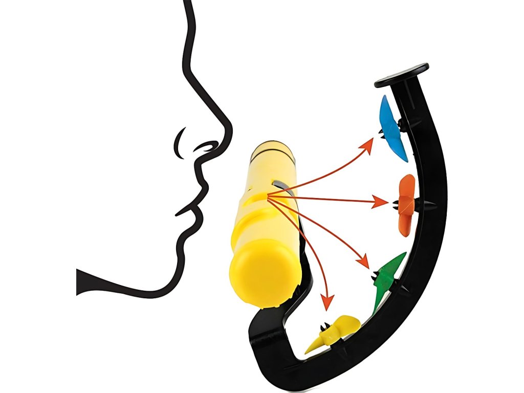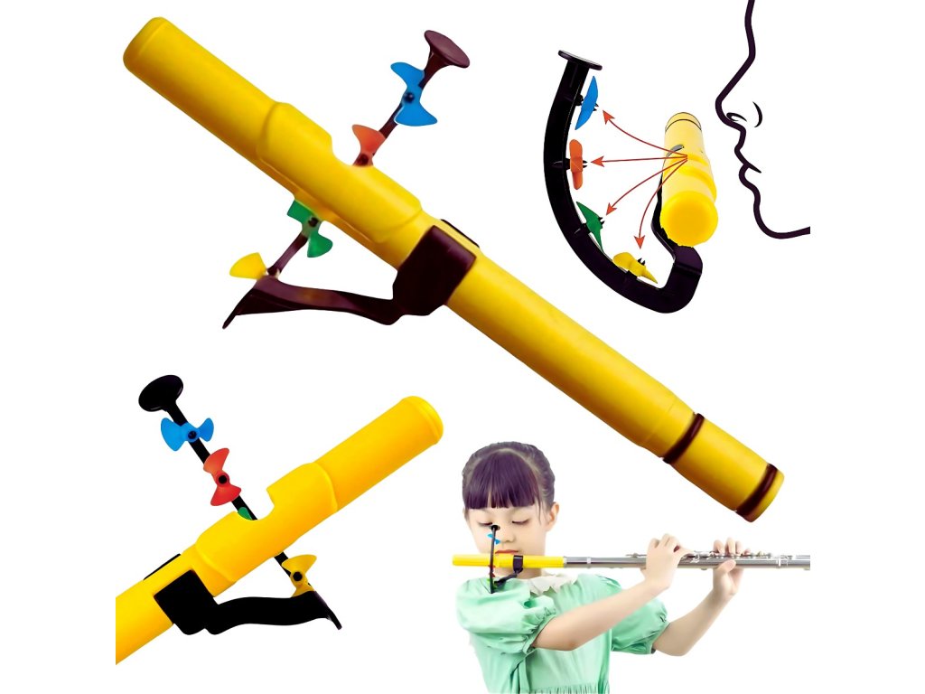 Wyjątkową cechą V-TONE FP1 są czterokolorowe wiatraczki (niebieski, żółty, czerwony i zielony) umieszczone na kilku poziomach, które ułatwiają kontrolę kierunku strumienia powietrza. Poprzez prawidłowe ułożenie ust podczas dmuchania użytkownik ma możliwość precyzyjnego kształtowania dźwięku. To rozwiązanie pomaga w ćwiczeniu kontroli oddechu i wzmacnianiu mięśni twarzy, co jest nieocenione podczas codziennych ćwiczeń. Dzięki temu narzędziu osiągnięcie czystych i pełnych tonów staje się znacznie łatwiejsze dla każdego ucznia.