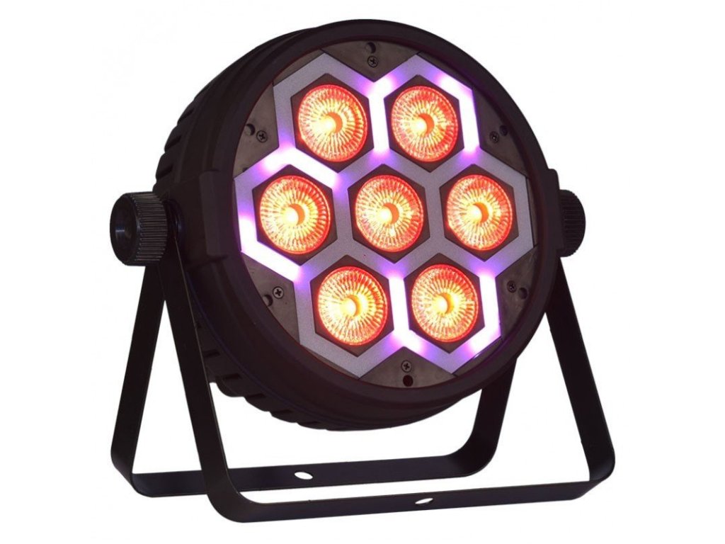 LIGHT4ME FRAME PAR 7x12 LED RGBW to nowoczesny reflektor LED z efektami neonowymi i tęczowymi, przeznaczony dla producentów oświetlenia poszukujących nietypowych i innowacyjnych rozwiązań. Urządzenie, oprócz tradycyjnych siedmiu systemów LED, posiada wokół każdego z nich ramę świetlną, która przypomina plaster miodu. Takie rozwiązanie pozwala tworzyć dodatkowe efekty świetlne i odróżnia naszą instalację oświetleniową od innych. Ponadto Frame Par posiada ciekawe ulepszenie w postaci filtrów konwersji CTB i CTO, które pozwalają na zmianę temperatury barw światła. Precyzyjny system mieszania kolorów pozwala na pracę z paletą ponad 16 milionów kombinacji.