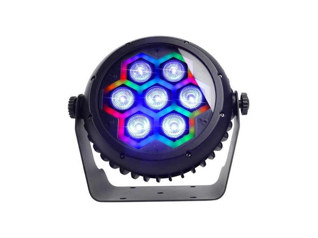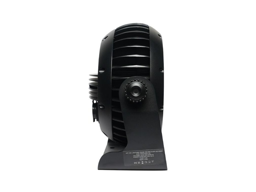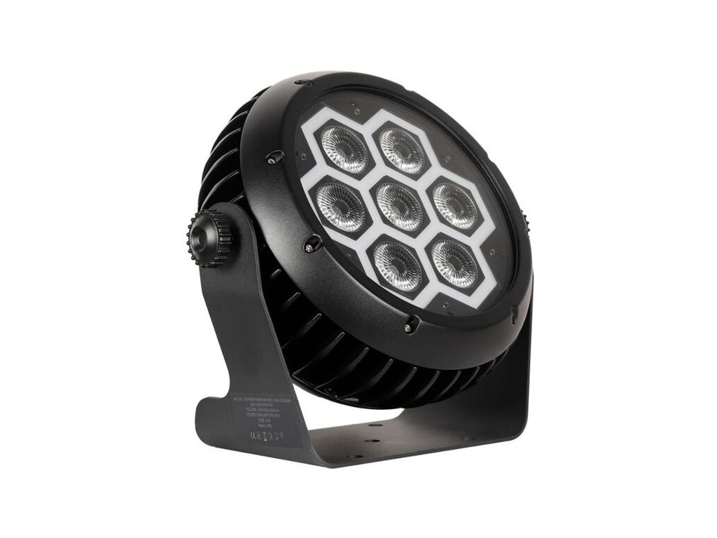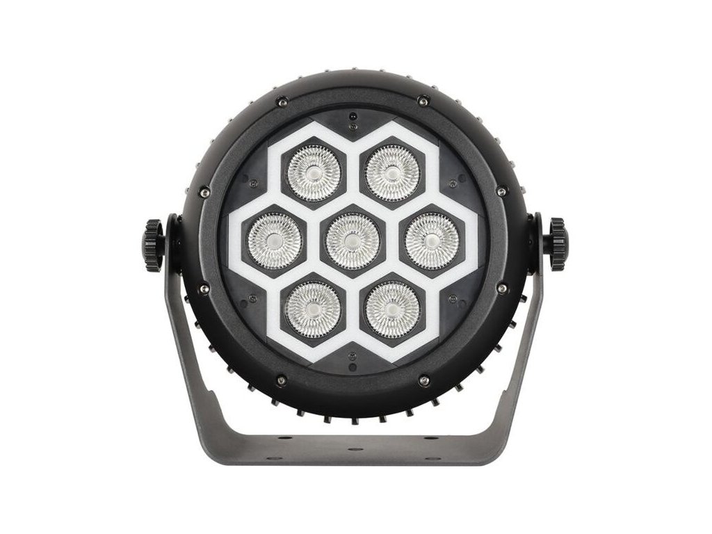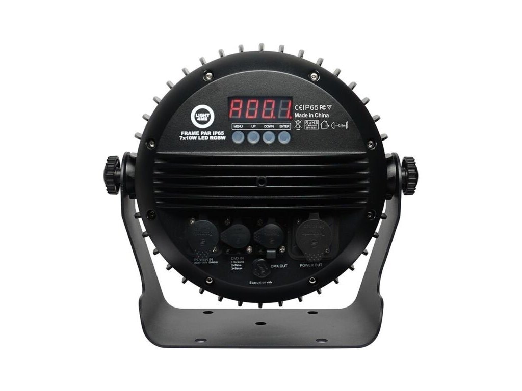 LIGHT4ME Frame PAR IP65 7x10W LED RGBW to profesjonalny reflektor sceniczny wyposażony w 7 wydajnych diod 10W RGBW LED oraz 39 diod SMD LED z klasą ochrony IP65, która chroni przed wpływem warunków atmosferycznych i umożliwia jego stosowanie w środowiskach zewnętrznych. Reflektor oferuje kąt świecenia 26°, pełny zakres ściemniacza (0-100%) oraz stroboskop z regulowaną prędkością 1-25 błysków na sekundę, co zapewnia elastyczne oświetlenie dla różnych typów wydarzeń.