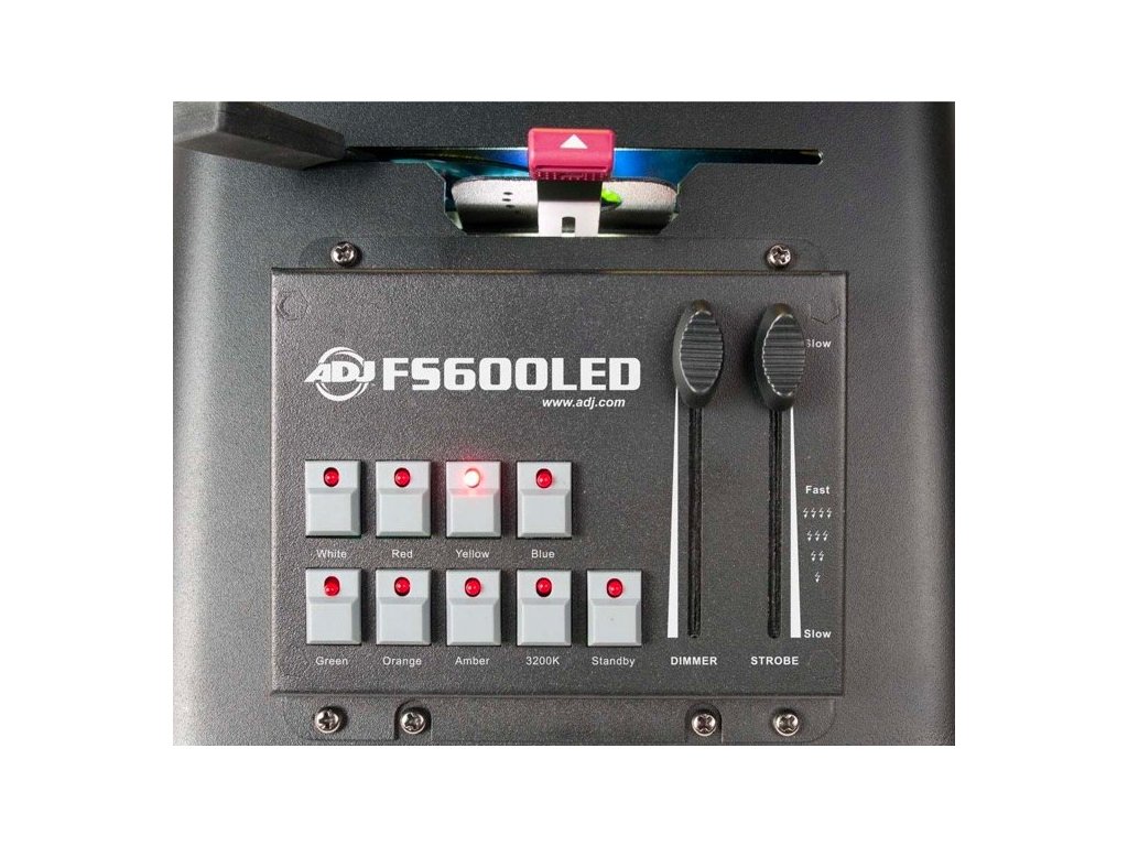 FS600LED firmy ADJ to nowoczesny reflektor punktowy LED o mocy 60 W. Wykorzystuje jasne źródło LED o mocy 60 W, ma 8 kolorów, zmienną prędkość stroboskopu i możliwość ściemniania. Dodatkowe funkcje obejmują: regulowaną przysłonę irysową, migawkę do ręcznego kadrowania oraz 3-pinowy i 5-pinowy protokół DMX. Obudowa ma pobór mocy zaledwie 60 W i nie nagrzewa się.
