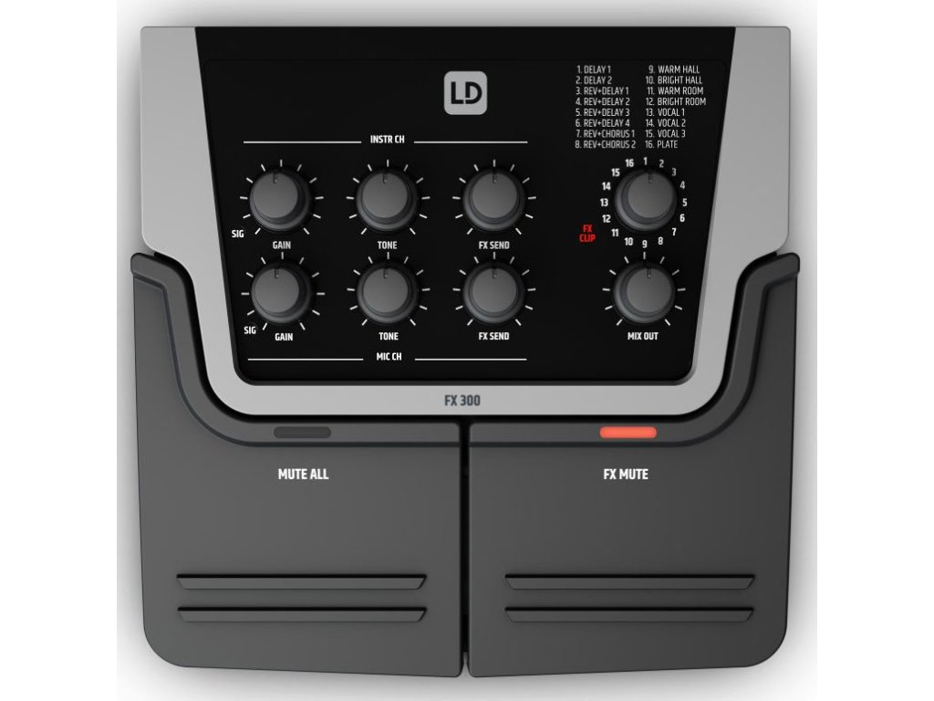 LD Systems FX 300 zachwyci Cię od samego początku Twojego występu, nawet jeśli miałeś mało lub wcale czasu na przeprowadzenie próby dźwięku. To małe, ale praktyczne urządzenie służy nie tylko jako pedał efektów do zmiany brzmienia Twojego głosu i instrumentu, ale jest to również łatwy w obsłudze dwukanałowy mikser. Zdecydowanie najlepszą funkcją są pedały, które pozwalają sterować funkcjami wyciszania nogami lub rękami. A jeśli chcesz coś powiedzieć, możesz po prostu wyciszyć wszystkie efekty za pomocą pedału FX MUTE, dzięki czemu Twój głos będzie słyszalny głośno i wyraźnie bez pogłosu i opóźnienia, a wszyscy w pomieszczeniu zrozumieją Twoją wiadomość. Aby sygnał z mikrofonu lub instrumentu nie przedostał się do wyjść, wystarczy nacisnąć pedał MUTE ALL.