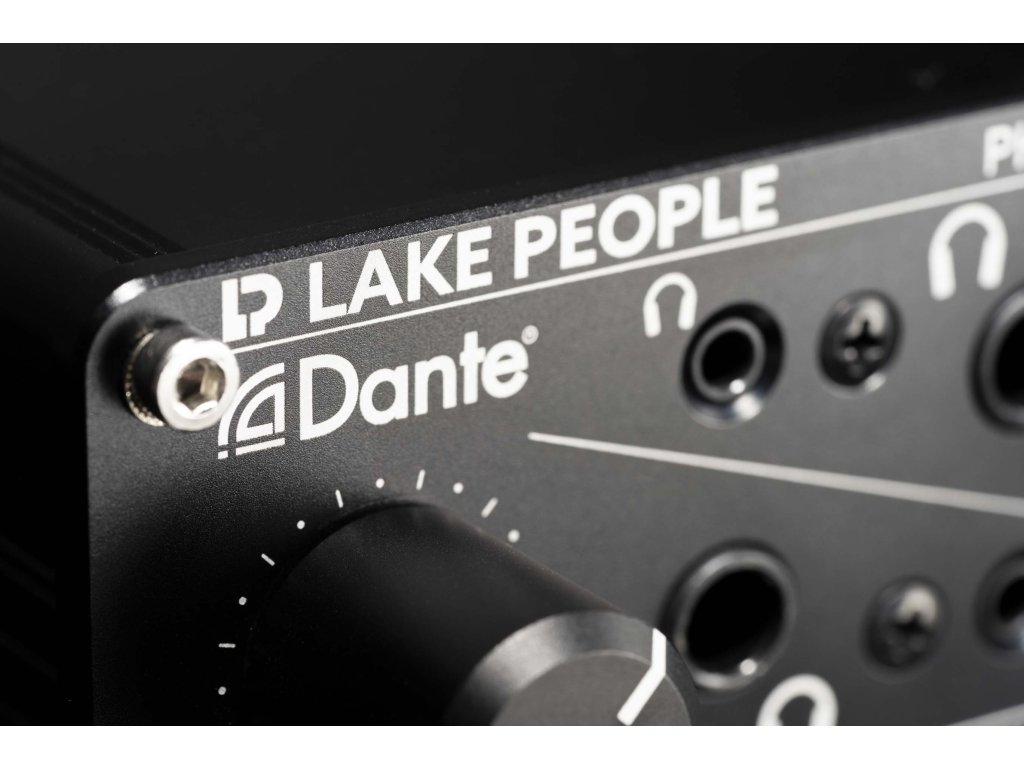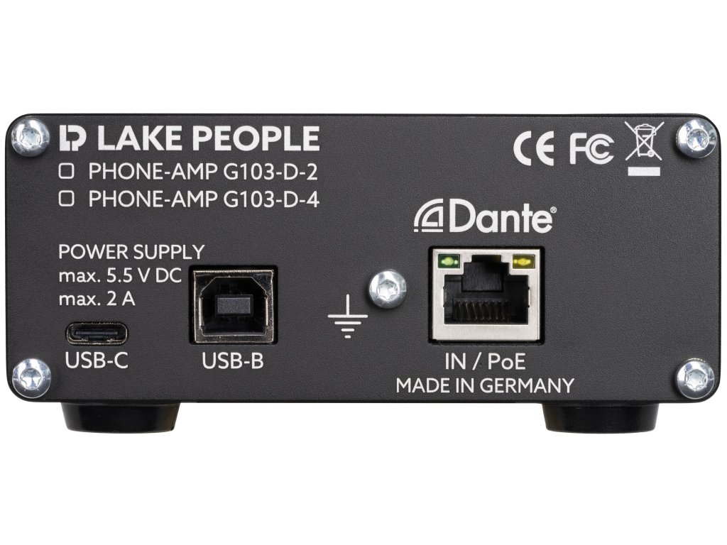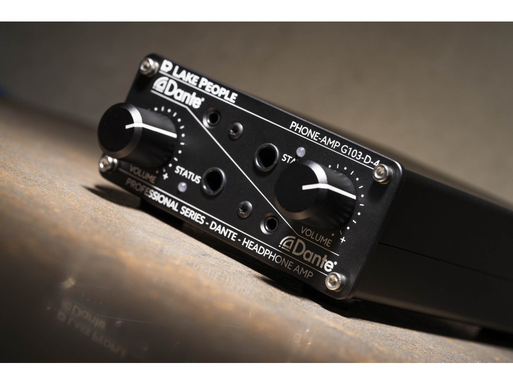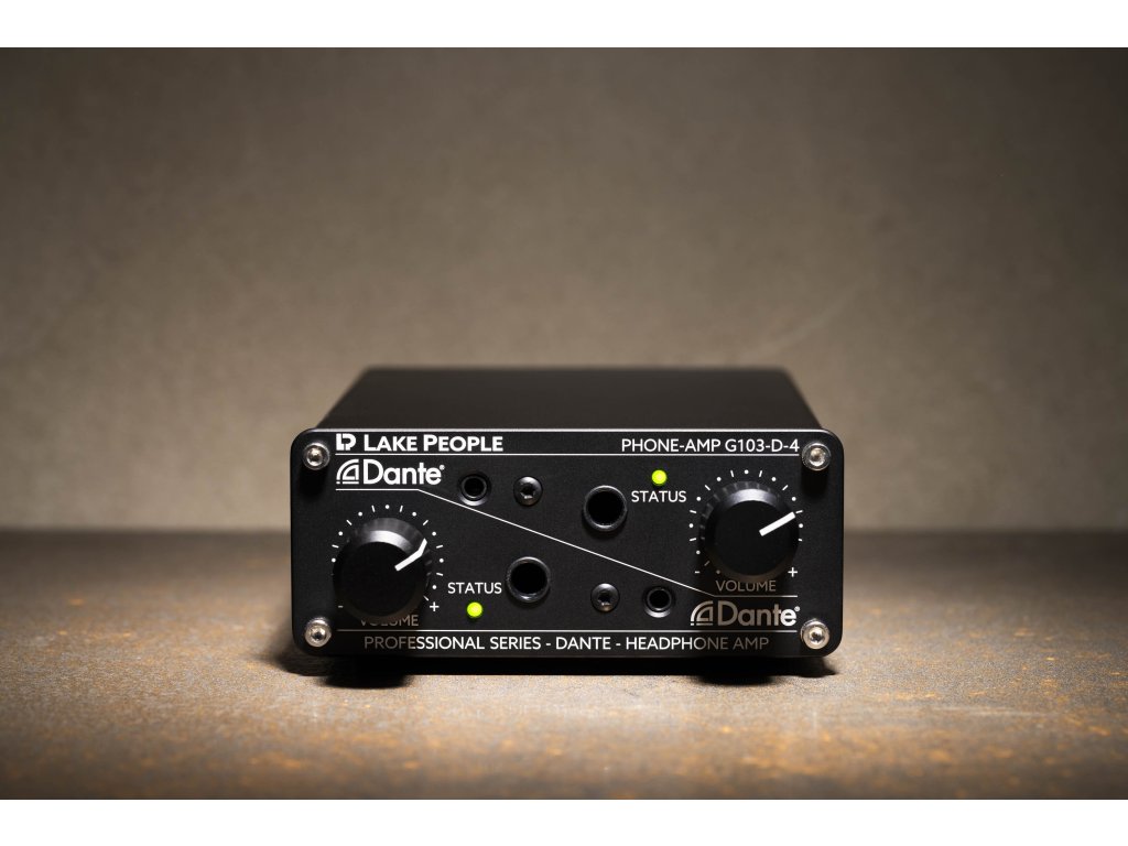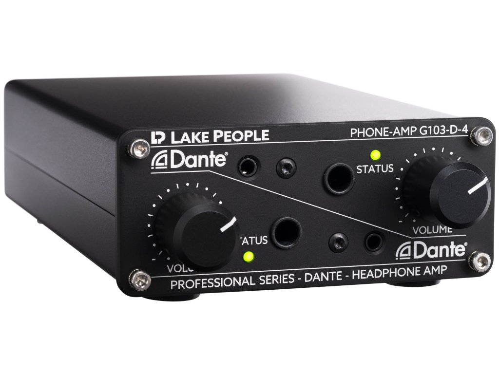 Cyfrowe sygnały audio DANTE są doprowadzane standardowym złączem RJ45. Lake People G103D4 odbiera 4 kanały audio. Rozpakowane sygnały audio wchodzą do dwóch wysokiej jakości przetworników D/A. Uzyskane sygnały analogowe są doprowadzane do buforów, tłumione w domenie analogowej, a następnie wysyłane do wydajnych wzmacniaczy słuchawkowych.