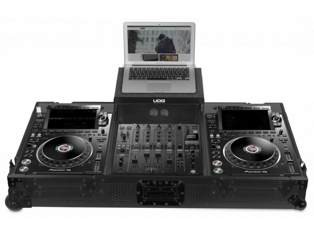 Solidna obudowa na zestaw DJ Pioneer CDJ-3000/A9, formowana pianka o wysokiej gęstości, wyściółka ochronna, stylowe, nowoczesne czarne wykończenie, zdejmowany panel przedni i otwór na kable, kółka ułatwiające transport, półka na notebooka.