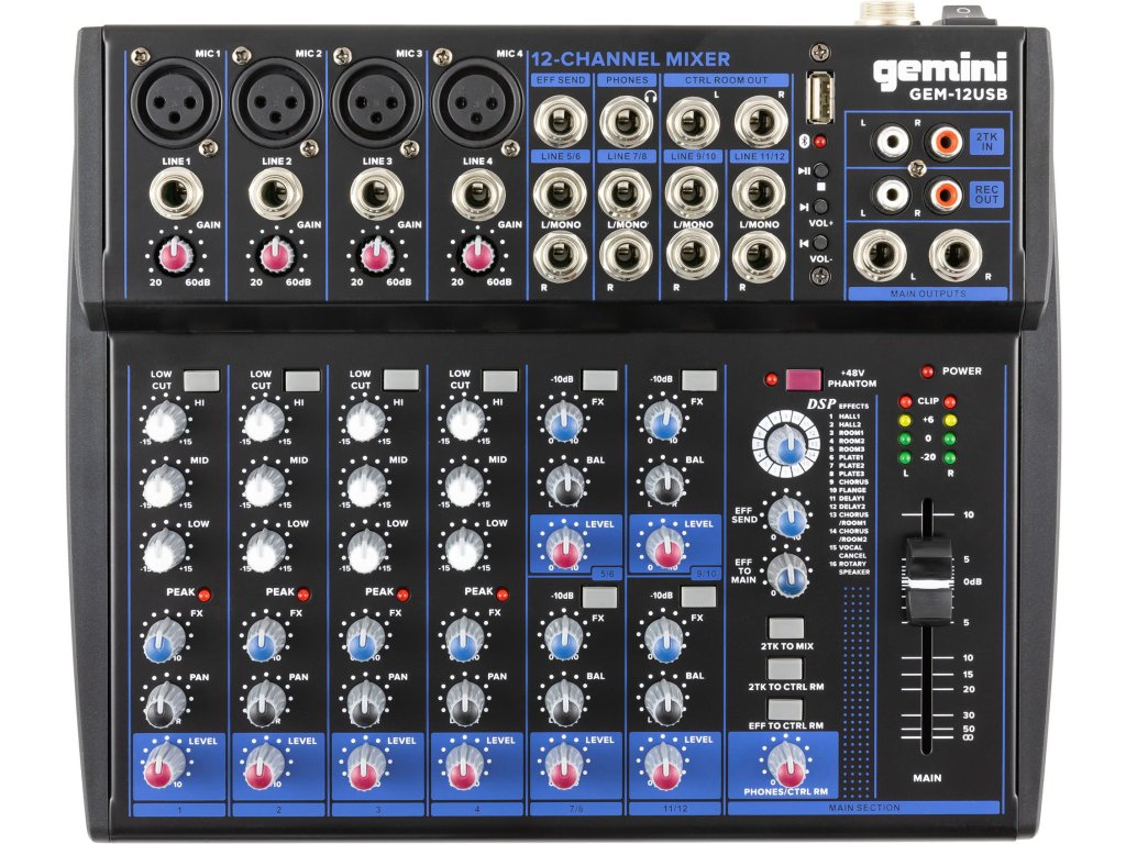 Nowy mikser Gemini GEM-12USB jest wyposażony w 12 wejść, 4 najnowocześniejsze przedwzmacniacze mikrofonowe z zasilaniem phantom, streaming Bluetooth, odtwarzanie USB, wewnętrzny moduł efektów z 16 efektami, 3-pasmowy equalizer i dwie oddzielne szyny.Nowy mikser Gemini GEM-12USB jest wyposażony w 12 wejść, 4 najnowocześniejsze przedwzmacniacze mikrofonowe z zasilaniem phantom, streaming Bluetooth, odtwarzanie USB, wewnętrzny moduł efektów z 16 efektami, 3-pasmowy equalizer i dwie oddzielne szyny.