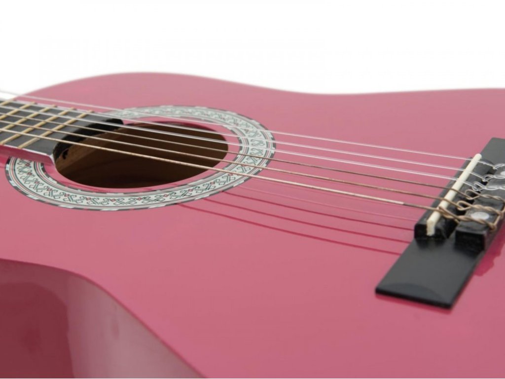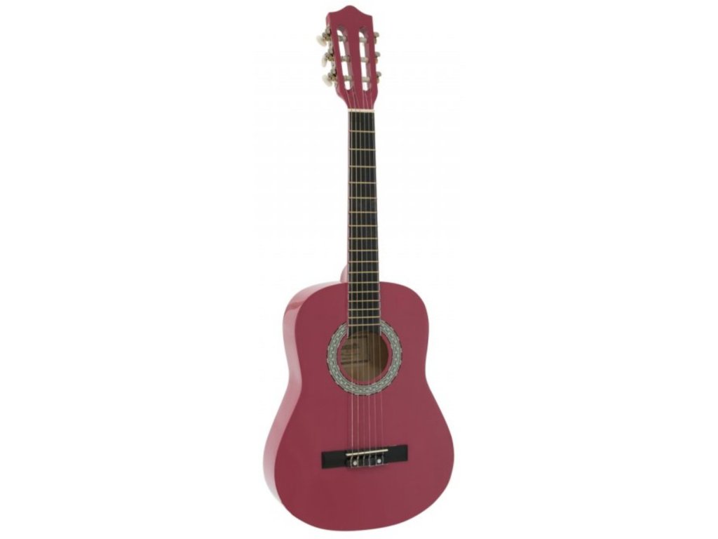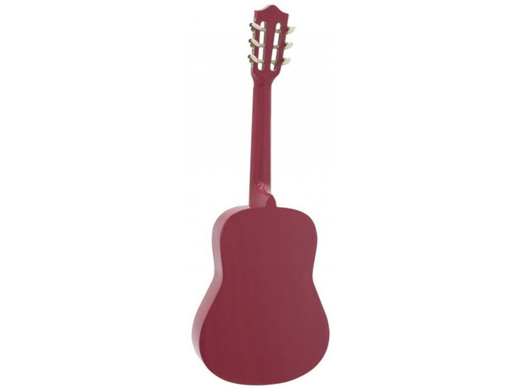 Gitara klasyczna 1/2. Płyta wierzchnia, płyta spodnia i boki akacjowe, gryf klonowy, podstrunnica z bejcowanej sklejki, mostek z bejcowanego klonu. Kolor różowy.