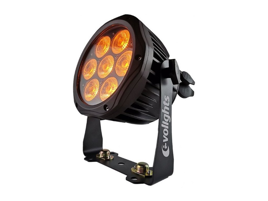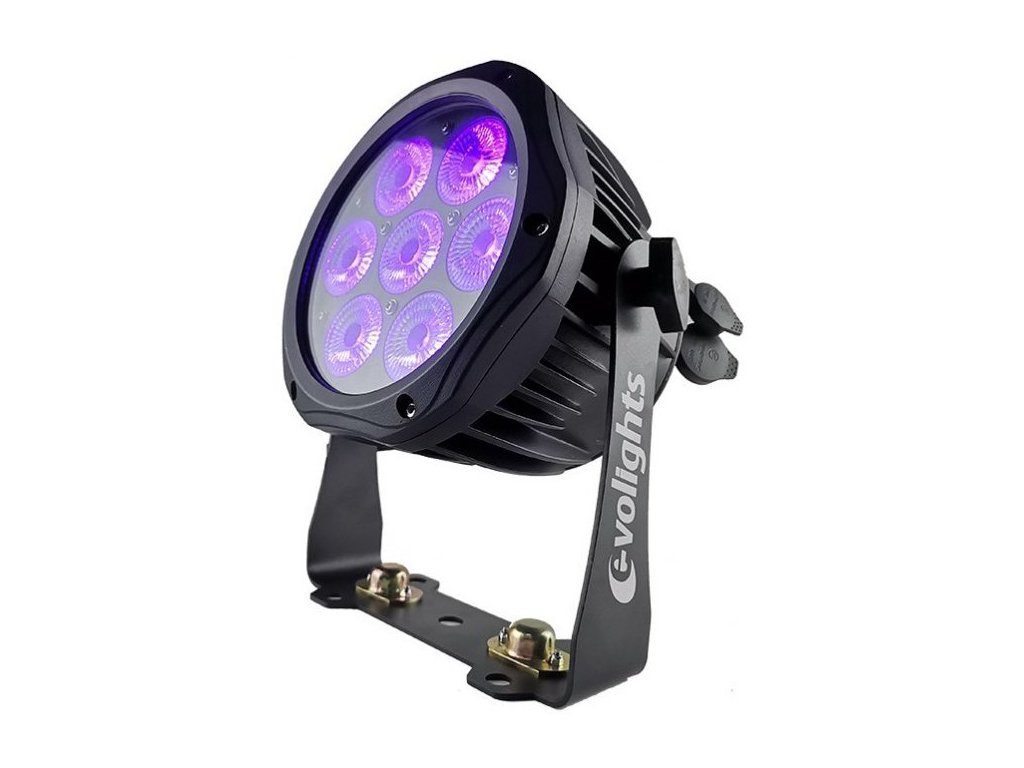 EVOLIGHTS Glacier 7 RGBWA + UV to profesjonalne oświetlenie punktowe LED wyposażone w 7 wysokowydajnych diod LED o mocy 10 W pracujących w palecie barw RGBWA (czerwony, zielony, niebieski, ciepły biały, pomarańczowy) i ultrafioletowym (UV). Dzięki obudowie o wysokim stopniu ochrony (IP65) naświetlacz idealnie nadaje się na otwarte sceny muzyczne, koncerty, festiwale i różnego rodzaju imprezy, w teatrze i telewizji, a także do zewnętrznego oświetlenia architektonicznego.
