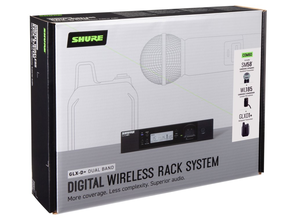 - Odbiornik GLXD4R+ (do montażu w szafie rack), mikrofon ręczny SM58, mikrofon krawatowy WL185, zasilacz sieciowy, akumulator litowo-jonowy SB904, kabel instrumentalny WA302 (TA4F na 1/4"), etui na zamek błyskawiczny, adapter, zestaw do montażu w szafie rack