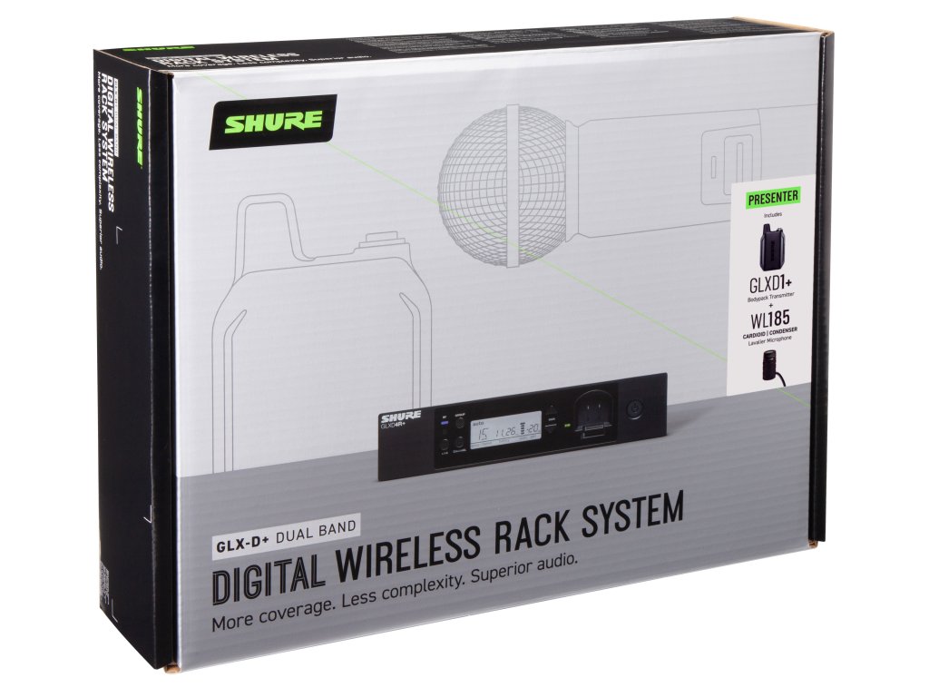 Shure GLXD14R+/85 to cyfrowy zestaw bezprzewodowy przeznaczony do nagrywania mowy. Składa się z mikrofonu krawatowego (lavalier) WL185, nadajnika bodypack GLXD1+ i odbiornika rack GLXD4R+. Zestaw pracuje w nielicencjonowanych pasmach 2,4 i 5,8 GHz, zapewnia dźwięk w 24-bitowej rozdzielczości z zakresem dynamicznym do 120 dB. Sprawdzi się wszędzie tam, gdzie stawia się wysokie wymagania dotyczące niezawodności transmisji i czystości dźwięku. Przejrzyste sterowanie umożliwia łatwe uruchomienie całego systemu, kompaktowe wymiary i niska waga nadajnika gwarantują użytkownikowi nieograniczoną mobilność. Odbiornik jest przystosowany do montażu w szafie rack.