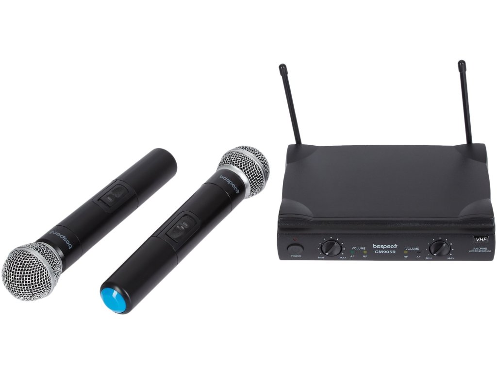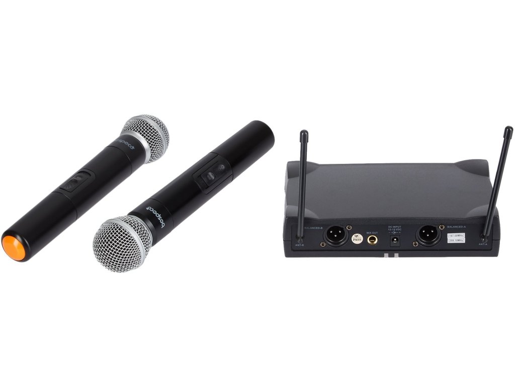 Podwójny zestaw bezprzewodowy zawierający dwa dynamiczne mikrofony ręczne z systemem VHF, odpowiedni dla moderatorów, na imprezy karaoke lub występy wokalne na żywo. Odbiornik zawiera parę zintegrowanych anten, dwa regulatory głośności poszczególnych kanałów na przednim panelu. Tylny panel zawiera parę wyjść XLR i wyjście liniowe do podłączenia do PA lub miksera. Transmisja bezprzewodowa może odbywać się na odległość do 50 m.