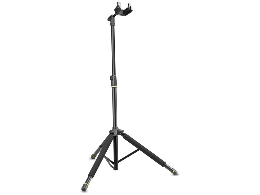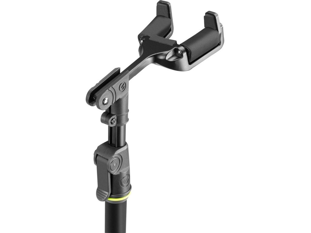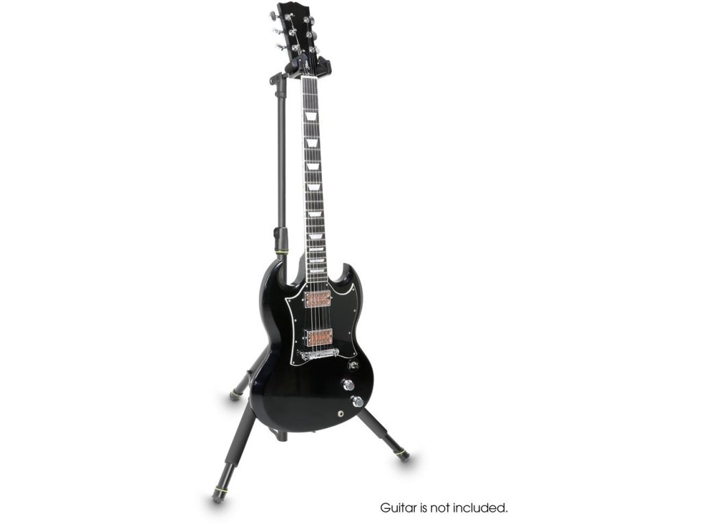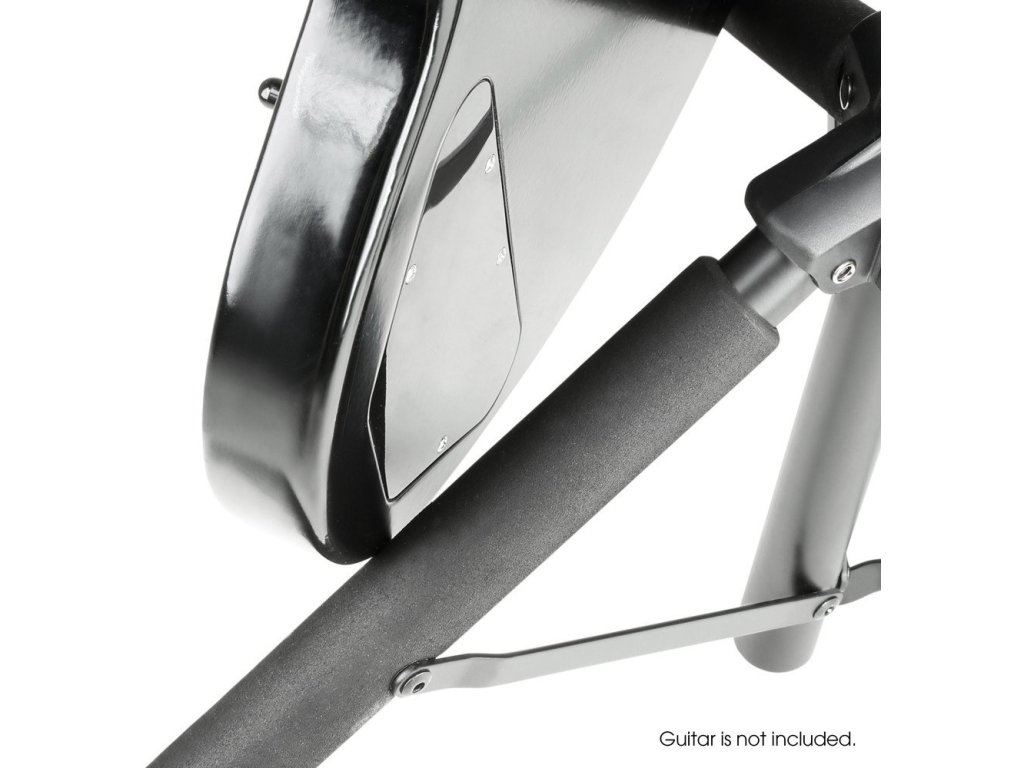GS 01 NHB to stabilny i elegancki stojak gitarowy do gitar akustycznych, elektrycznych i basowych. Można go regulować na wysokość do 108 cm i można go złożyć. Sprytny mechanizm "neck hug" automatycznie zabezpiecza gitarę w widełkach szyjki przed zsunięciem i automatycznie się otwiera, gdy podnosisz instrument ze statywu. Miękka wyściółka chroni gitarę przed zarysowaniami i nie uszkadza lakieru.