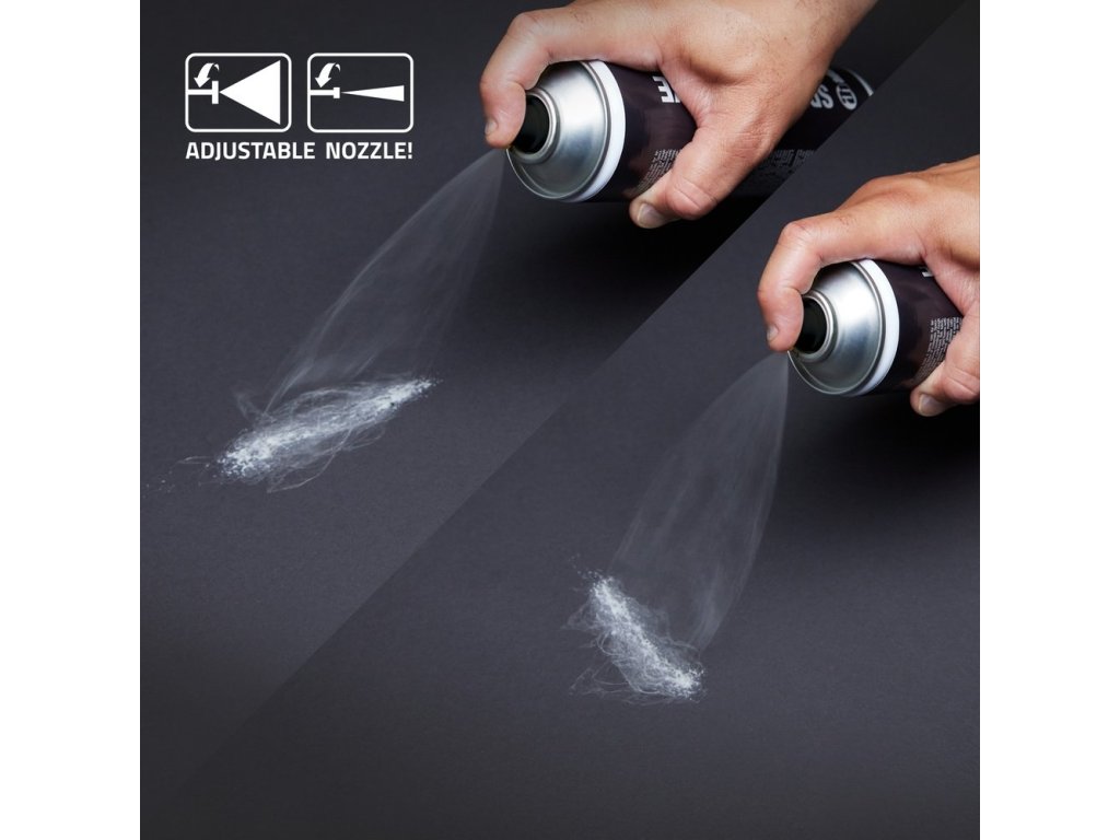 Za pomocą specjalnego zaworu można ustawić pozycję natrysku w pionie lub w poziomie. W zależności od materiału, jedną puszką można skleić do 4 metrów kwadratowych materiału. Po wyschnięciu klej jest odporny na temperatury od -20 °C do 60 °C.