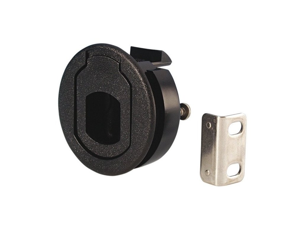 Wpuszczany zatrzask dźwigniowy drzwi serwisowych. Czarny plastik (POM). Montowany w drewnie o grubości 7-13 mm. Śruby ze stali nierdzewnej.