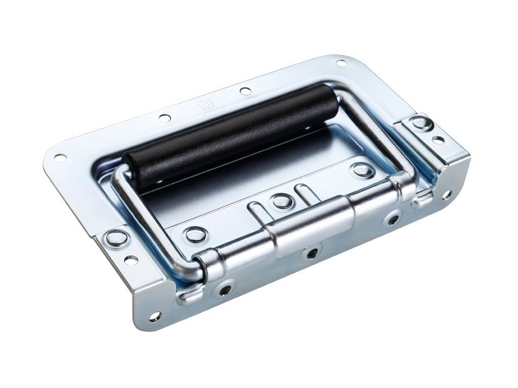 Wpuszczony uchwyt sprężynowy do montażu na krawędzi. Stal ocynkowana z czarnym uchwytem z PVC.