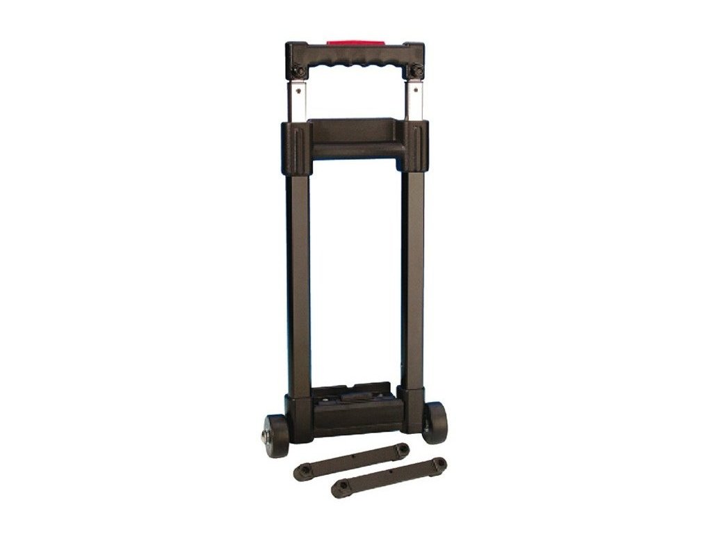 Odłączany wózek walizkowy z wysuwaną rączką na podwójnych profilach aluminiowych i kółkach 50 mm na stalowej osi. Wózek mocuje się do plastikowych uchwytów (w zestawie).