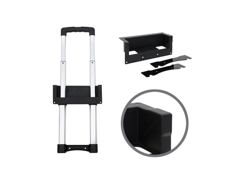 Wpuszczany uchwyt teleskopowy z dwoma stopniami, mechanizm blokujący z przyciskiem zwalniającym w uchwycie, do montażu wewnątrz kufra, w zestawie podkładki do stosowania z drewnem o grubości 7 mm.