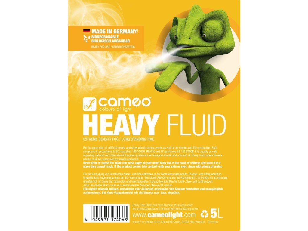 Płyn Cameo Heavy Fluid jest przeznaczony do wszystkich standardowych wytwornic dymu i tworzy szczególnie gęsty i długotrwały biały dym. Jest bezwonny, a dzięki doskonałym właściwościom odbijającym światło idealnie nadaje się do spektakularnych pokazów świetlnych i laserowych. Płyn Cameo Heavy Fluid jest produkowany w Niemczech pod stałą kontrolą jakości. Jest bezpieczny i nietoksyczny.