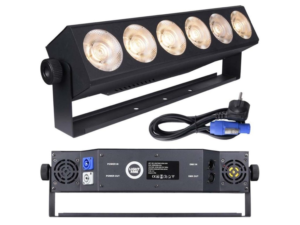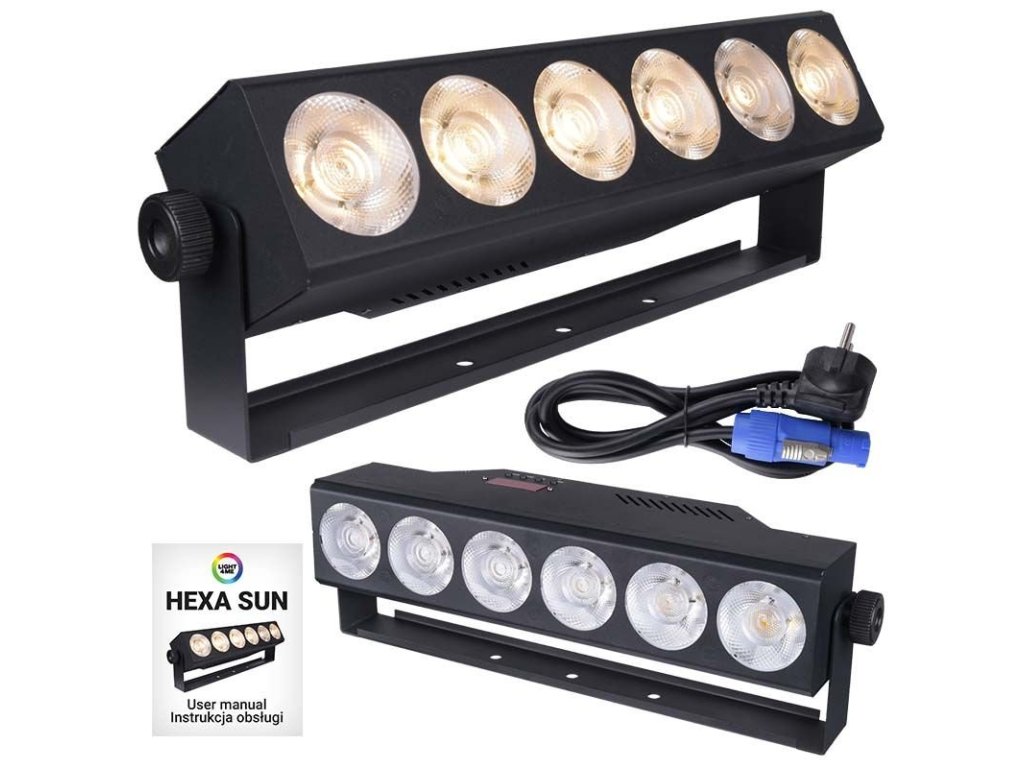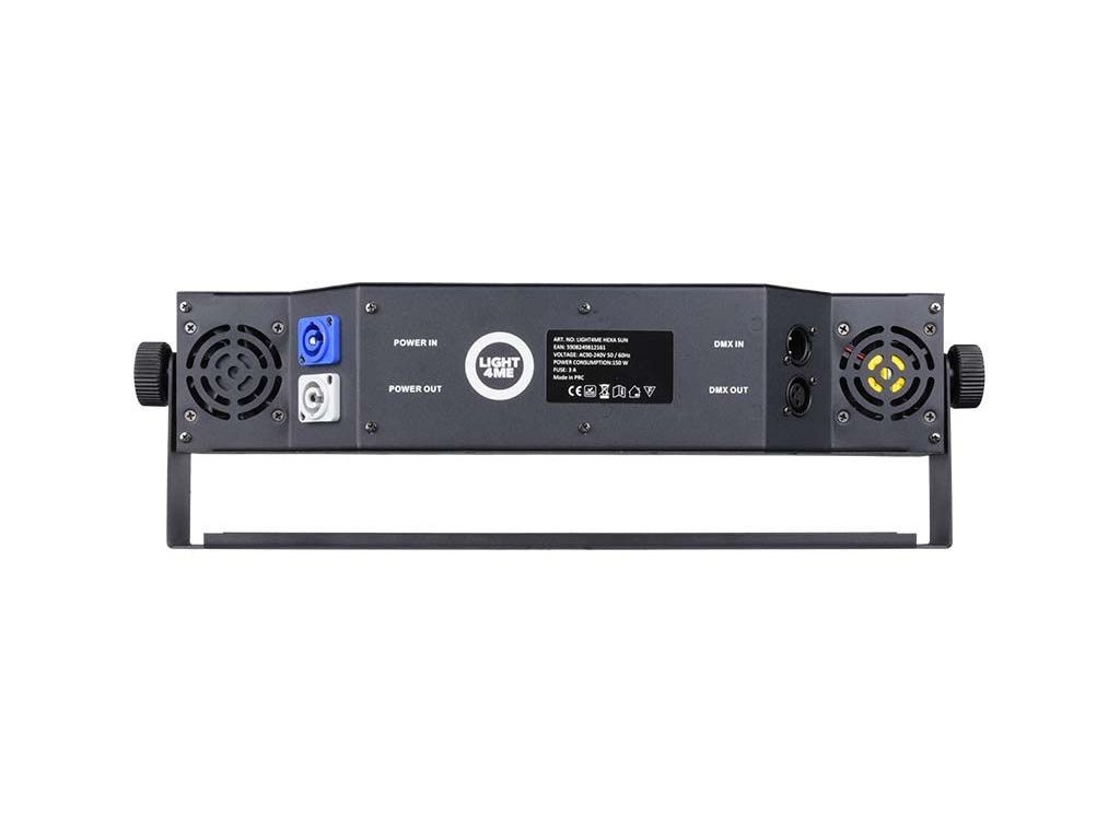 Light4Me Hexa Sun oznacza wysoką wydajność, wysokiej jakości komponenty oraz solidne i staranne wykonanie. Listwa wyposażona jest w 6 diod LED emitujących światło o temperaturze barwowej 3500 kelwinów. Dzięki tak niskiej temperaturze barwa świeci bardzo przyjemnym, ciepłym światłem. Specjalna konstrukcja obudowy umożliwia wygodny dostęp do złączy DMX i gniazd powercon. Dodatkowo, dzięki wyjściu zasilania, możliwe jest przesyłanie napięcia bezpośrednio z urządzenia na urządzenie, co eliminuje potrzebę posiadania wielu punktów dostępu do źródła zasilania.