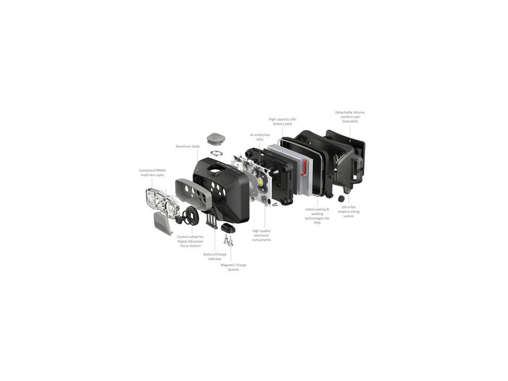 - Smukła, ładowalna latarka czołowa z trzema poziomami jasności i czerwonym światłem przednim