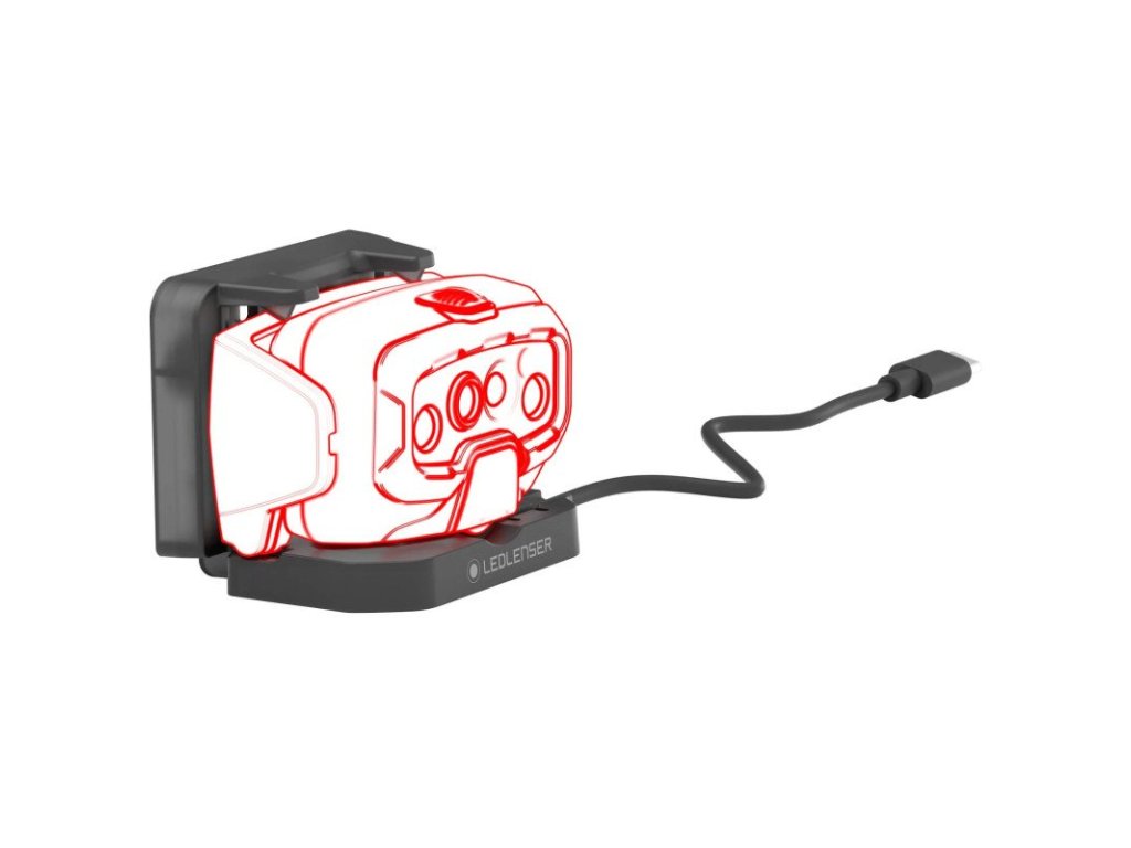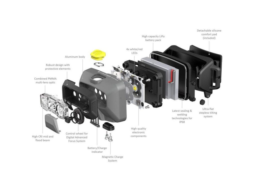 - Smukła, ładowalna latarka czołowa z trzema poziomami jasności i czerwonym światłem przednim