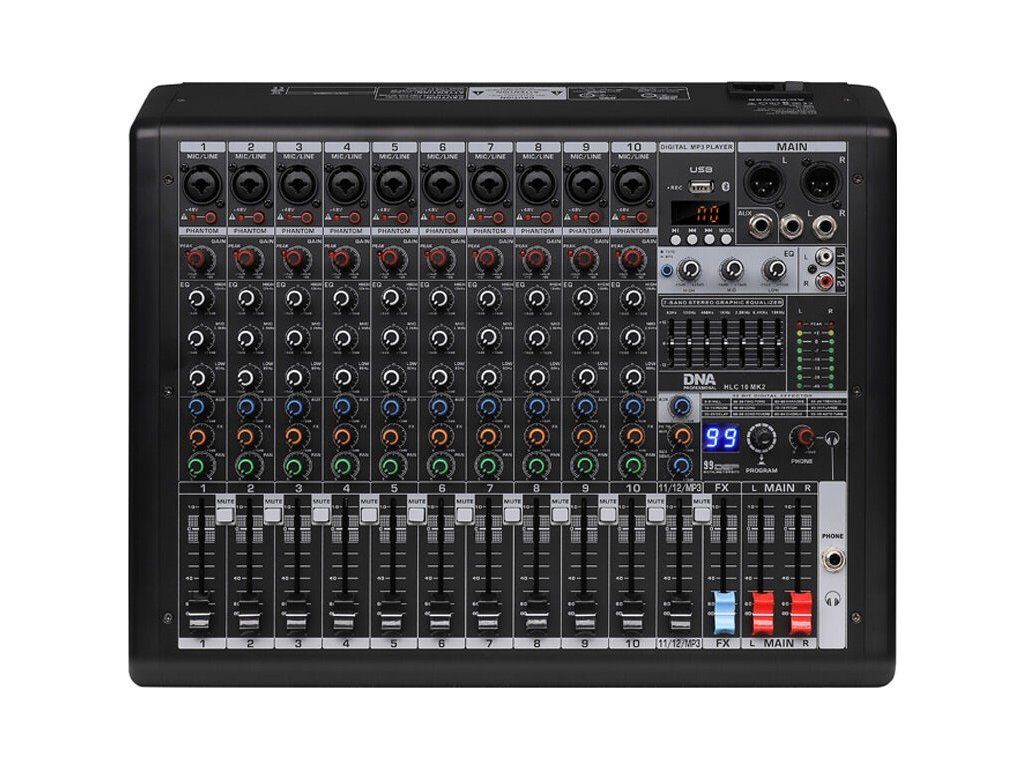 DNA HLC 10 MK2 to profesjonalny analogowy mikser audio wyposażony w dziesięć wejściowych kanałów mono i jeden wejściowy kanał stereo, wysokiej jakości przedwzmacniacze, port USB z funkcjami MP3 i REC oraz standard komunikacji bezprzewodowej Bluetooth. Urządzenie doskonale sprawdzi się jako mikser sceniczny podczas koncertów i występów estradowych, w salach prób, a także w domowym studiu nagrań.