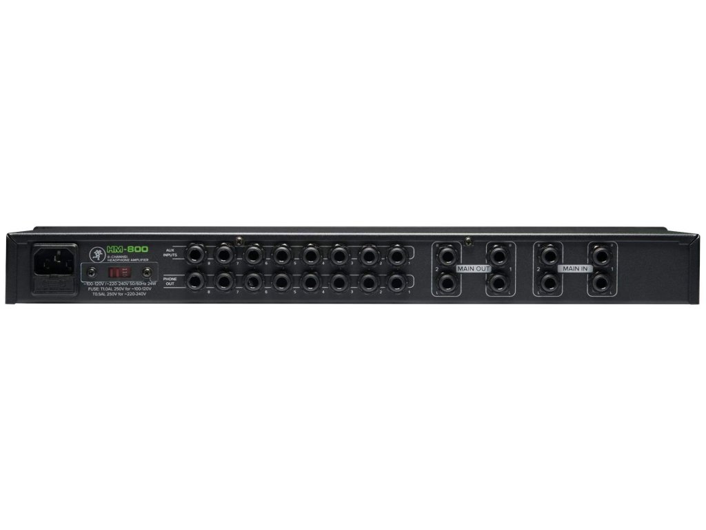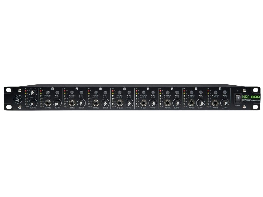Wzmacniacz słuchawkowy Mackie HM-800 oferuje dwa dyskretne wejścia stereo z oddzielną regulacją głośności i łącznie osiem kanałów z dwoma wyjściami słuchawkowymi. Dostępnych jest łącznie 16 wyjść słuchawkowych, dzięki czemu bez problemu można nagrywać np. chóry. Na każdym kanale znajduje się miernik LED z siedmioma stopniami, wejście aux z regulowaną głośnością, przełącznik kanału wejściowego i przełącznik stereo/mono.
