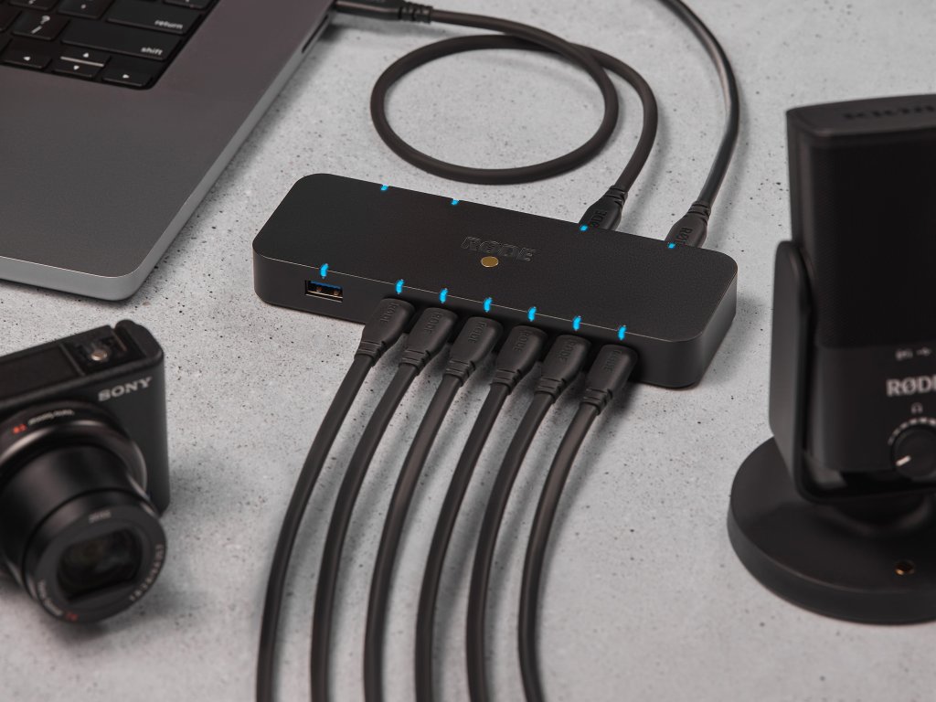 RODE Hub to siedemportowy koncentrator USB przeznaczony dla twórców treści i profesjonalistów wymagających szybkiego i niezawodnego przesyłania danych oraz zasilania. Dzięki możliwości podłączenia do siedmiu urządzeń jednocześnie, umożliwia wygodne zarządzanie urządzeniami peryferyjnymi, w tym kamerami, mikrofonami i dyskami zewnętrznymi. Konstrukcja Plug-and-play zapewnia natychmiastowe użytkowanie bez konieczności instalacji sterowników.