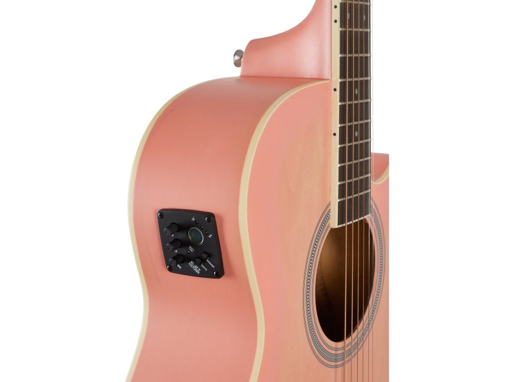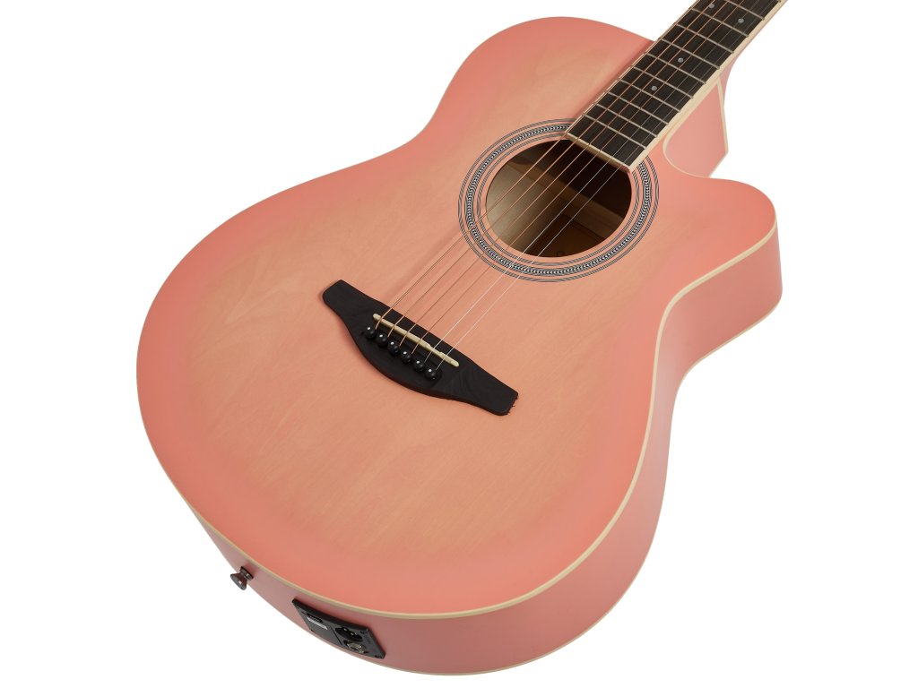 SOUNDSATION HW-CE PK to przystępna cenowo gitara elektroakustyczna zaprojektowana z myślą o wygodzie i wszechstronności. Jej kształt wywodzi się z popularnego Mini Jumbo, co czyni ją idealnym towarzyszem zarówno dla początkujących muzyków, jak i doświadczonych graczy poszukujących niezawodnego instrumentu do niezobowiązującego grania.