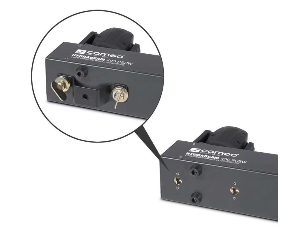 Wytrzymała konstrukcja z czarnej stali i ABS posiada podświetlany wyświetlacz z czterema przyciskami dla łatwej obsługi. Cameo HydraBeam 400 może być obsługiwany uniwersalnie z napięciem sieciowym od 100 do 240 V; zużycie energii jest niskie i wynosi 100 watów. Dla szerokiego zakresu opcji montażu, na przykład na belkach, w zestawie znajdują się dwa wsporniki Omega i odłączany kołnierz statywu.