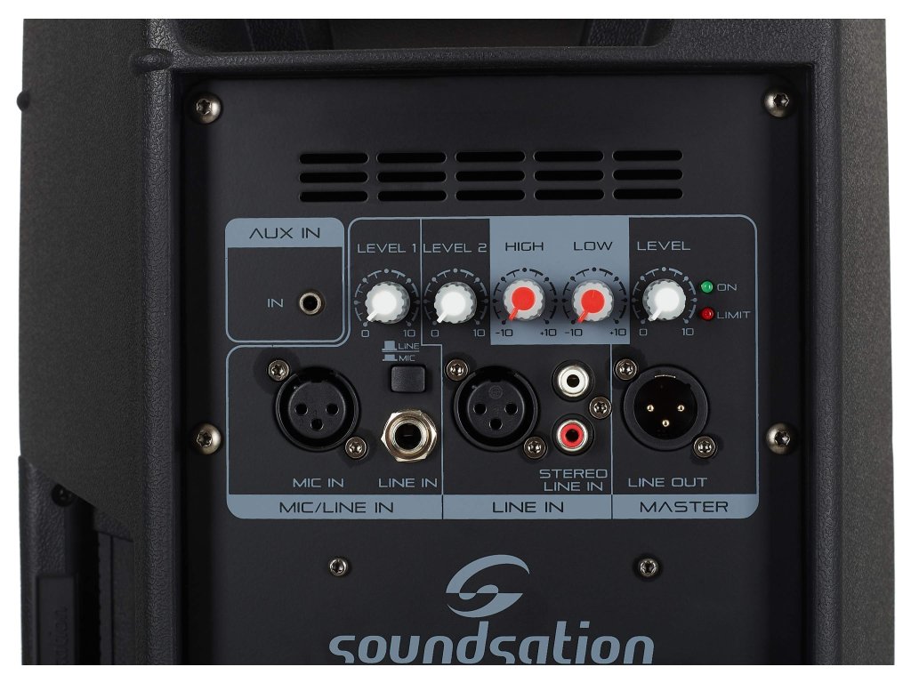 Głośnik kryje w sobie 10" głośnik basowy i 1" głośnik wysokotonowy z kątem promieniowania 90 x 60 stopni, który za pomocą wzmacniacza Bi-amp klasy D zapewni maksymalną moc do 500W (440 LF + 60 HF). Tylny panel oferuje dwa wejścia XLR, jedno Jack 6,3 mm i stereofoniczne wejście RCA do podłączenia odtwarzaczy muzycznych. Do kolejnego PA podłącz głośnik za pomocą wyjścia XLR. Ponadto znajdują się tutaj dwa pokrętła Volume, master Volume i dwupasmowy equalizer do regulacji sygnału dźwiękowego.