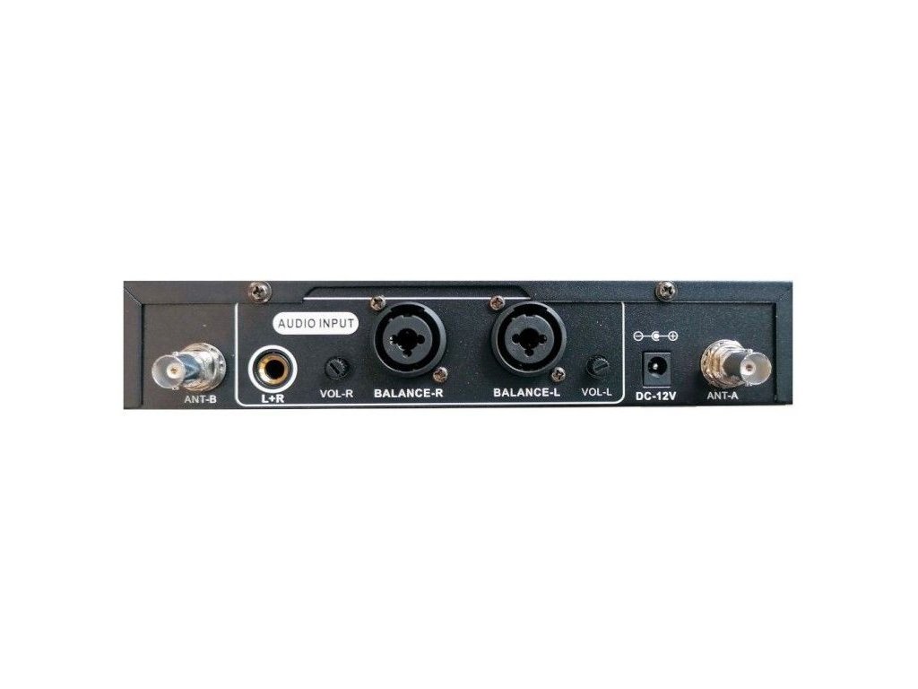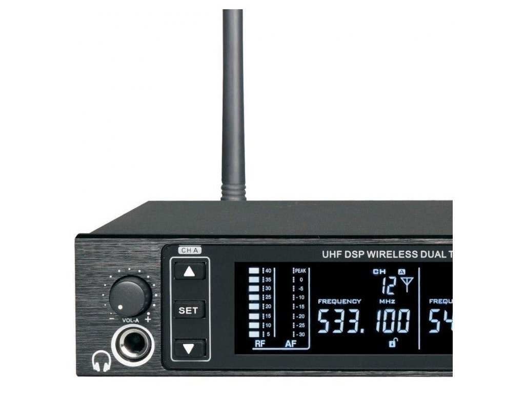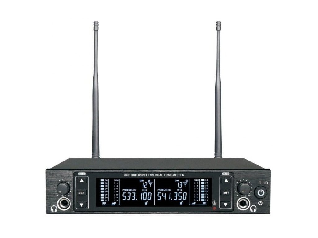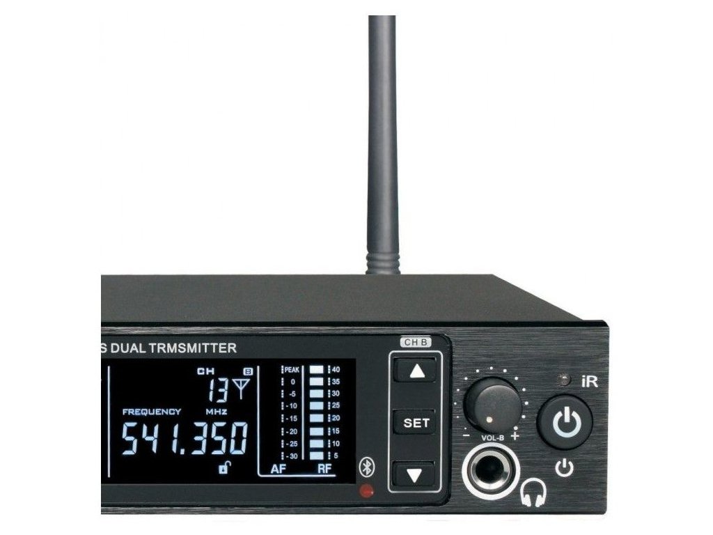 Drugą częścią systemu jest nadajnik fal radiowych o zakresie częstotliwości od 518 do 542 MHz. Z tyłu obudowy znajdują się dwa kombinowane wejścia - XLR / Jack dla lewego (L) i prawego (R) kanału z obrotowymi potencjometrami głośności, wejście stereo jack (6,3 mm), gniazdo do podłączenia zasilacza (w zestawie) oraz dwa złącza antenowe BNC. Z przodu znajduje się wyłącznik, dwa gniazda słuchawkowe z potencjometrami głośności oraz panel sterowania wyposażony w przyciski Up, Down, Set i czytelny wyświetlacz LCD. Wyświetla aktualne parametry systemu monitorowania dźwięku, takie jak poziom jakości sygnału, ustawienia częstotliwości zestawu lub wybrany kanał transmisji danych.