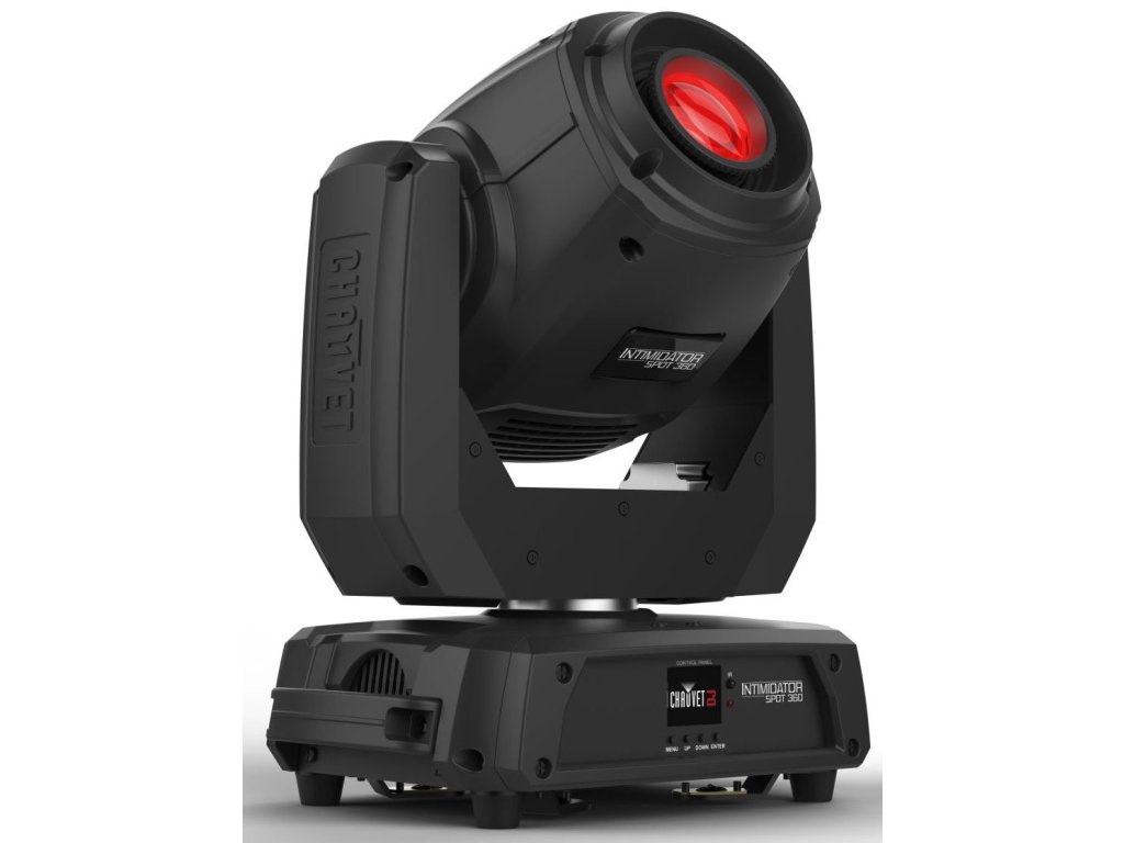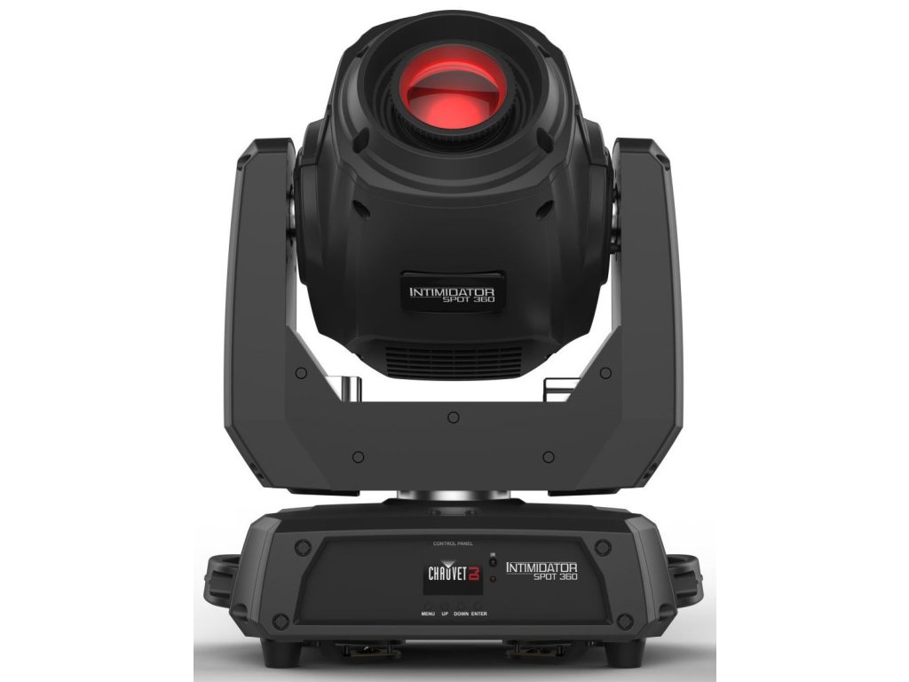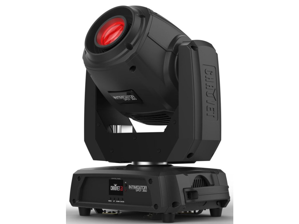 Chauvet Intimidator Spot 360 to największy i najbardziej zaawansowany model w nowej serii ruchomych głów Chauvet DJ. Podstawą efektu świetlnego jest dioda LED o mocy 100 W, której białe światło o potężnej intensywności do 35 000 luksów (@ 12° / 2 m) może być modyfikowane przez utalentowanego projektanta oświetlenia za pomocą 7+1 obrotowych, indeksowanych i wymiennych wzorów GoBO oraz 8+1 filtrów kolorów, które posiadają również zdolność wyświetlania dzielonych odcieni. Dostępne są również dwa pryzmaty, 3- i 5-fazetowe, oba z możliwością dwukierunkowej rotacji ze zmienną prędkością. Podobnie jak w mniejszym modelu 260, tutaj również można skorzystać z manualnego Zoom. Dzięki zdolności koncentracji mocy światła w wąskiej wiązce 5° dodaje możliwość projekcji efektów świetlnych na większą odległość, a zmotoryzowany Focus gwarantuje, że wzory GoBO będą idealnie odwzorowane na dowolnej odległości. Specjalnością firmy Chauvet DJ jest system Totem, który zapewnia stałe skierowanie wiązek światła na parkiet taneczny, a dodatkowo umożliwia zaprogramowanie i zapisanie własnego pokazu wewnętrznego. Nowe moving heady są dostępne w kolorze czarnym i białym, a sterować nimi można zarówno protokołem DMX, jak i pilotem IRC-6.