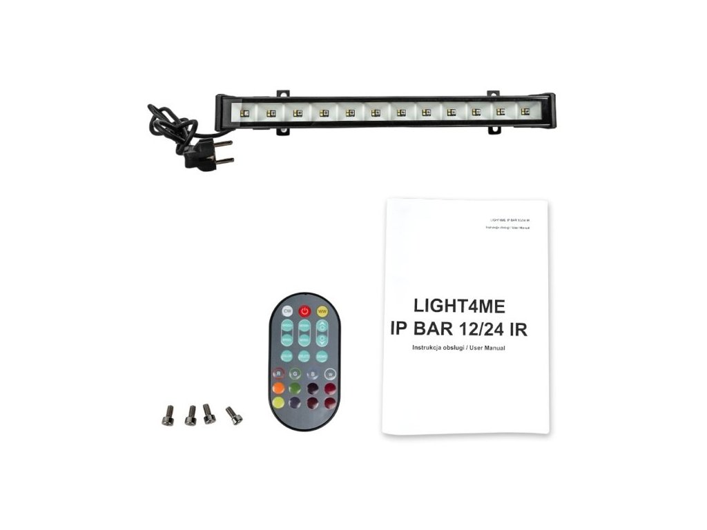 LIGHT4ME IP Bar 12 IR to profesjonalna listwa LED z klasą ochrony IP65, przeznaczona do dekoracji świetlnych i efektów scenicznych. Sterowanie może odbywać się za pomocą bezprzewodowego pilota na podczerwień lub przez Bluetooth za pomocą aplikacji na smartfonie. Ta listwa LED, wyposażona w 12 wydajnych diod LED 3W w kolorach RGB/CCT, oferuje użytkownikowi możliwość wyboru spośród kilku trybów kolorystycznych, w tym możliwość precyzyjnej regulacji jasności i uruchomienia pętli automatycznych programów operacyjnych. LIGHT4ME IP Bar 12 IR jest idealny na koncerty, do klubów tanecznych, sal weselnych, dyskotek, a dzięki solidnej obudowie nadaje się również na imprezy plenerowe.