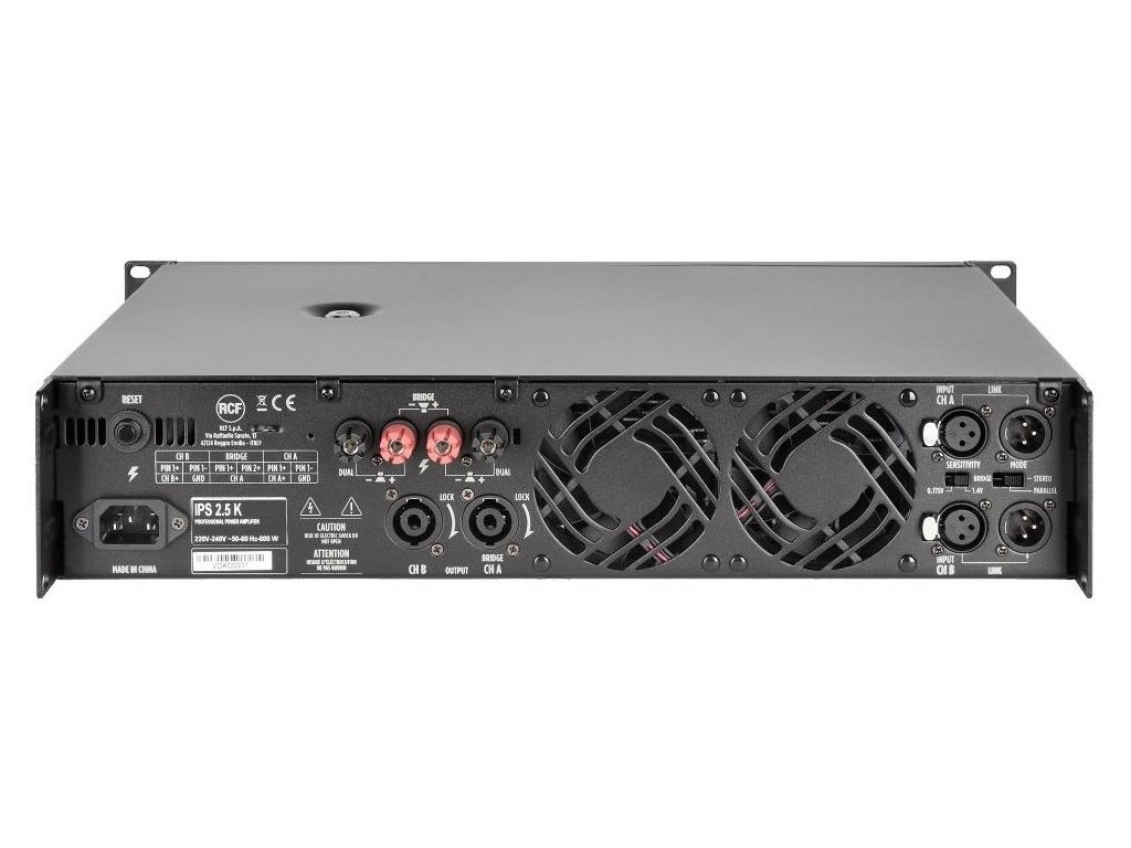 Seria IPS to seria dwukanałowych profesjonalnych wzmacniaczy, które łączą najnowszą, wysokowydajną technologię wzmacniania mocy klasy H z długoterminową niezawodnością. IPS 2.5K to dwukanałowy wzmacniacz mocy, który zapewnia moc do 2 x 1250 W przy impedancji 4 omów. Jest wyposażony w niezależne sterowanie wzmocnieniem, wskaźniki sygnału/przesterowania i awarii, stereofoniczne wejście i wyjście XLR, przełącznik stereo/równoległy/mostkowy, speakON i złącza wyjściowe binding post. Ponadto jest chroniony przed zwarciem. Dzięki wysoce wydajnym radiatorom i wentylatorom o zmiennej prędkości IPS 2.5K wytrzymuje ekstremalne warunki temperaturowe i zapewnia całkowitą niezawodność.