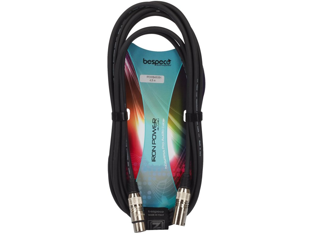 Kabel mikrofonowy Bespeco z serii Iron. Wnętrze kabla jest wykonane z miedzi OFC o czystości 98%, złącza z wytrzymałej stali, a powierzchnia z niezwykle mocnego PVC, co zapewnia maksymalną elastyczność i długotrwałą żywotność. W zestawie para pasków Velcro ułatwiających transport.