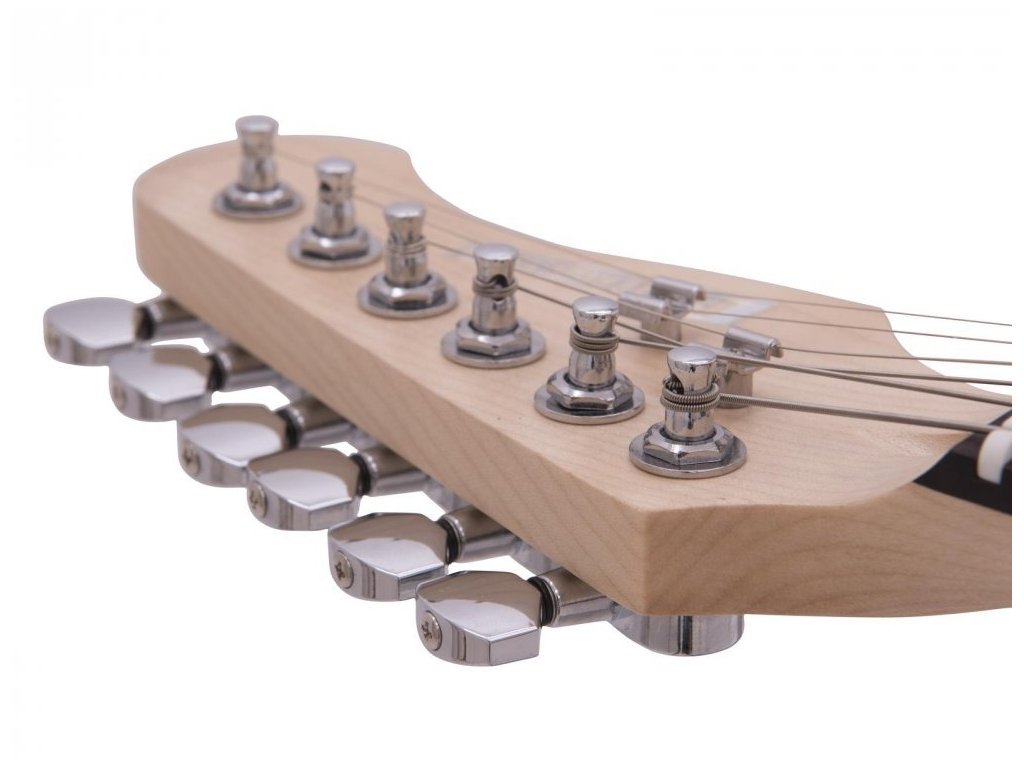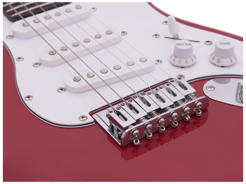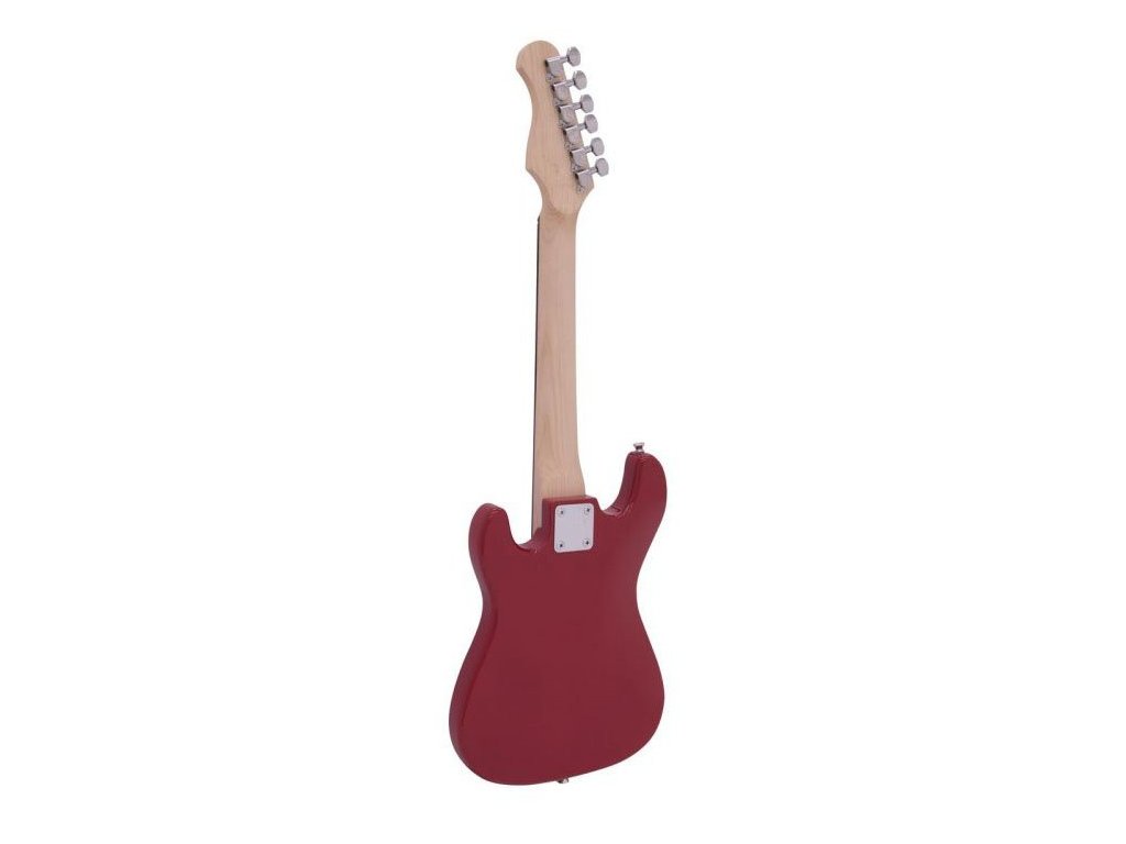 Dziecięca (1/2) gitara elektryczna ze skróconą menzurą 540 mm. Korpus z olchy, klonowy gryf, palisandrowa podstrunnica, gryf przykręcany, 21 progów. Gitara jest typu Stratocaster i jest wyposażona klasycznie w 3x przetwornik single coil. Czerwony, błyszczący kolor.