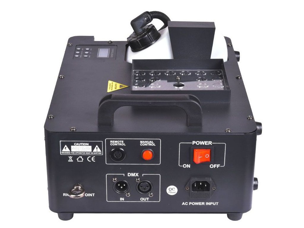 Urządzenie oferuje również możliwość bezprzewodowego sterowania. Na tylnej ściance wytwornicy, oprócz gniazda i wyłącznika, znajduje się również wejście i wyjście DMX oraz 5-pinowe wejście do podłączenia modułu odbiorczego (w zestawie) do bezprzewodowego sterowania zdalnego. Dzięki temu można sterować pracą urządzenia zdalnie z większej odległości.