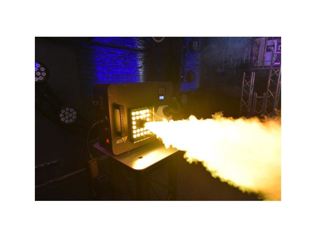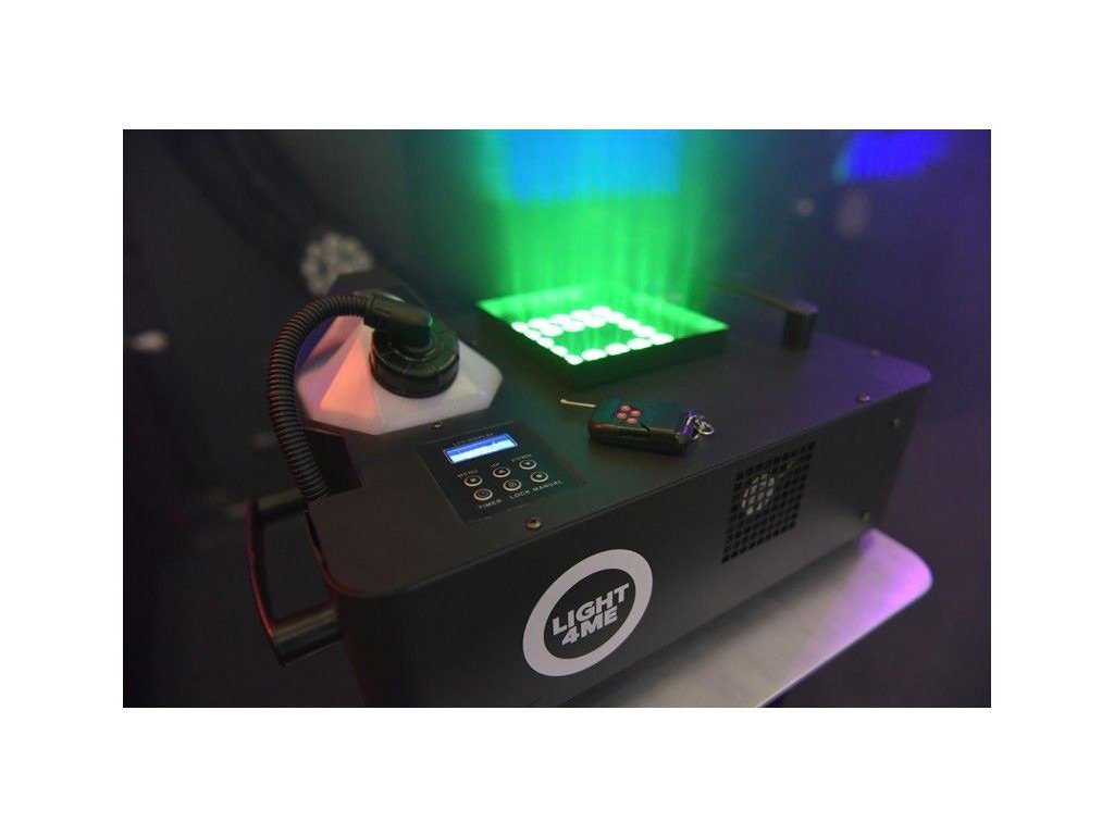 Light4Me Jet 2000 to wytwornica dymu idealna dla mobilnego DJ-a, zespołu, klubu lub dyskoteki. Komponenty maszyny zamknięte są w prostopadłościennej obudowie, która umożliwia jej pracę w dwóch pozycjach. Dzięki temu słup dymu może być wydmuchiwany pionowo lub prostopadle do ziemi. Pojemnik na płyn znajduje się w korpusie obudowy. Tuż obok znajduje się dysza wylotowa, która potrafi wyrzucić dym na odległość do 6 m! Wokół niego znajduje się układ mocnych diod RGB oświetlających sztuczną mgłę. W tej części korpusu znajduje się również panel sterowania wyposażony w sześć przycisków i wyświetlacz LCD. Za jego pomocą możemy ręcznie regulować np. parametry takie jak objętość emisji dymu, czas przerwy między emisjami (funkcja Timer), długość wygaszania, a także wybór sposobu działania diod LED lub ustawienie prędkości błysków.